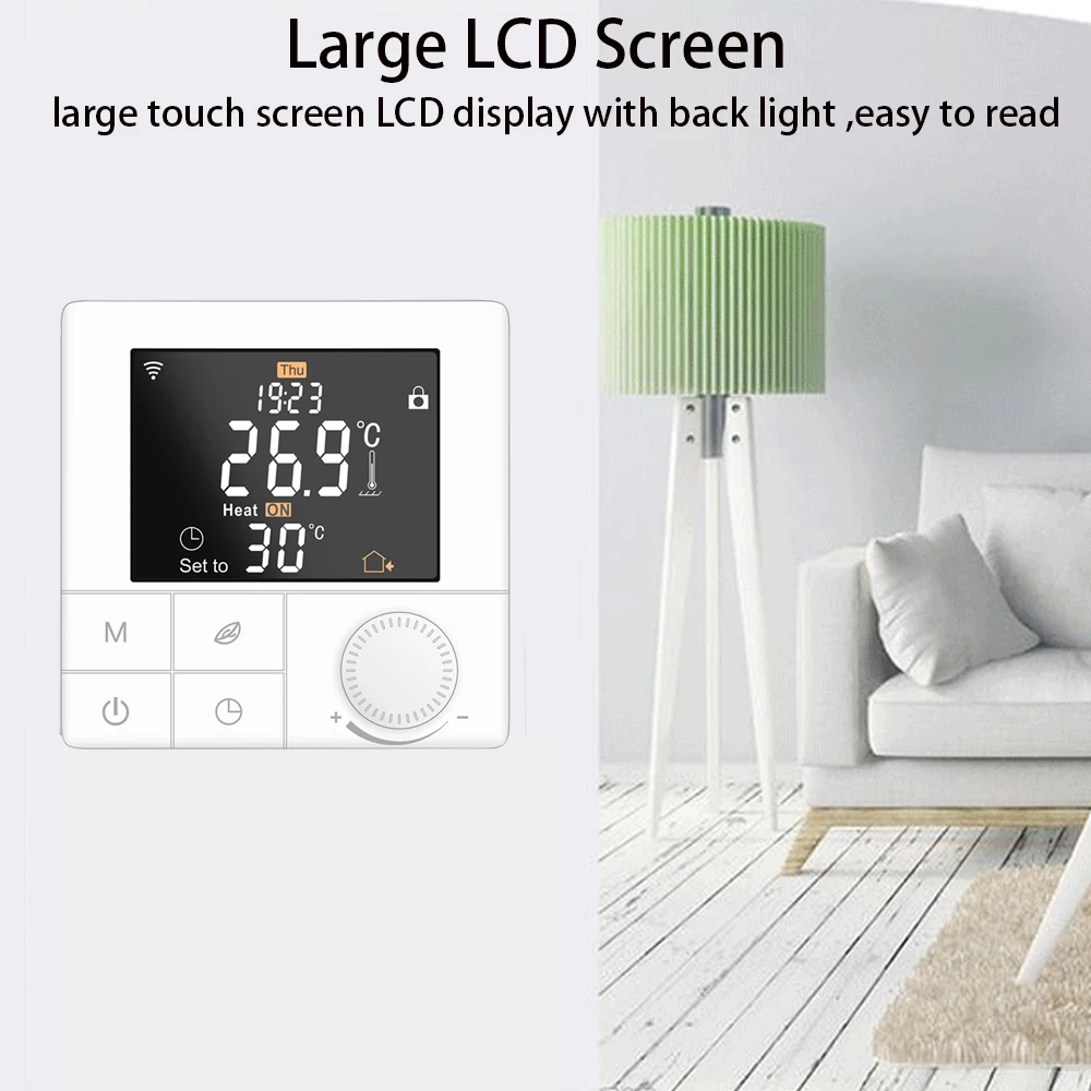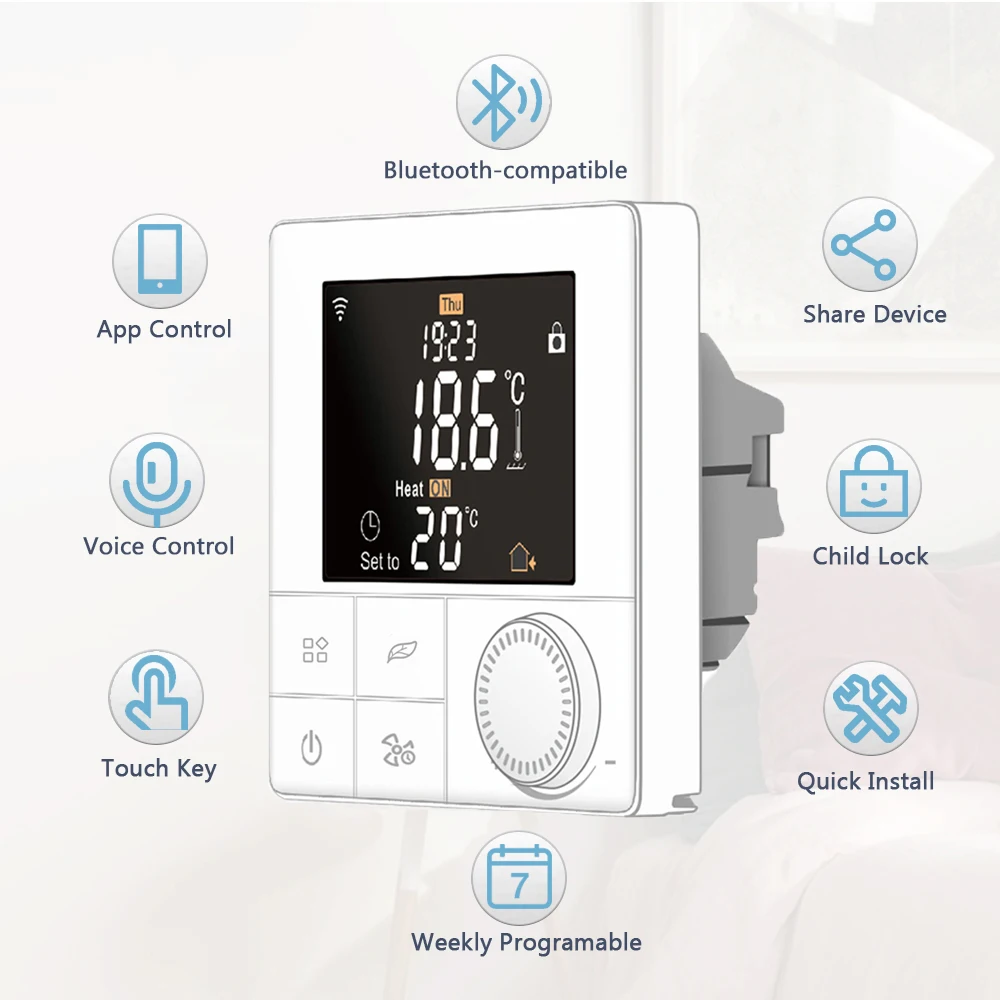 1. Большой экран и сенсорная кнопка2. Функция отключения памяти3. Функция сохранения данных в реальном времени4. 5 + 2 или 6 + 1 или 7 дней шесть периодов графика программы5. Функция анти-замораживания6. 3 режима датчика могут быть настроены7. Выбор 80 мм x 80 мм Европейская Скрытая коробка.8. С функцией блокировки ребенка