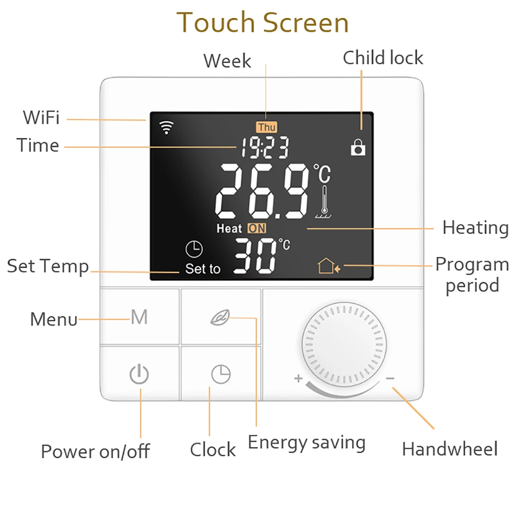 1. Продукт «без wifi» не имеет функции Wi-Fi, он не может управляться телефоном.2. Термостат с электрическим подогревом пола включает внешний датчик, термостат с водяным подогревом пола не включает внешний датчик!
