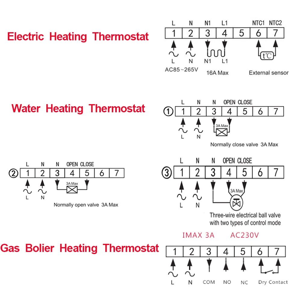 Напряжение питания: AC100 ~ 240 В; 50 ~ 60 ГцПотребляемая мощность: 1 Вт макс (Wi-Fi 3 Вт макс)Температура. Диапазон установки: 5 ~ 95 ℃Пол ограниченный диапазон: 5 ~ 47 ℃Вкл/Выкл отклонение: 0,5 ~ 10 ℃, заводскими настройками ± 1 ℃Температура окружающей среды:-5 ~ 50 ℃Уровень защиты: IP20Материал корпуса: огнестойкий Поликарбонат