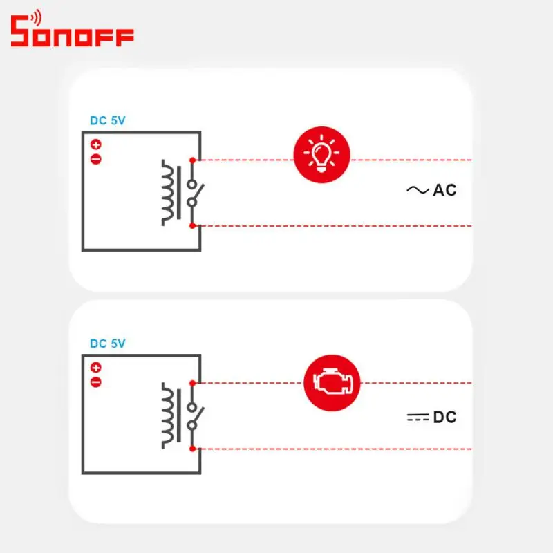 Вход 5VDC, размер и выход сухого контакта делают его отличным от традиционного продукта SONOFF, этот продукт является беспроводным переключателем, поддерживающим режим инширования/самоблокирования. Пользователи могут добавить устройство в приложение eWeLink для удаленного управления подключенными бытовыми приборами или устройствами. В режиме самоблокировки клиенты могут удаленно включать/выключать подключенные устройства немедленно. В режиме инчинга клиенты могут выбрать два способа подключения: