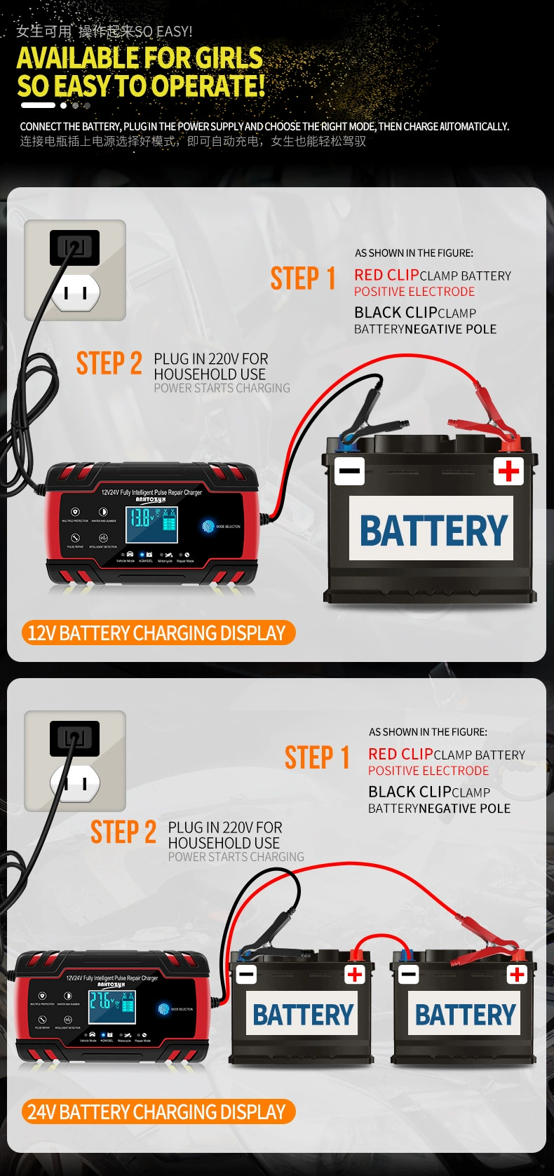 4. Зарядные устройства подходят для большинства типов батарей, включая кальций, гель и AGM, влажные батареи. Они также могут помочь восстановить сливные и сульфированные батареи.