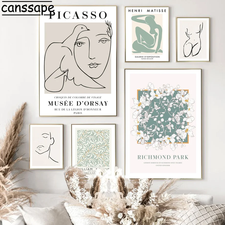 Абстрактная настенная живопись на холсте, линия, лица, тела, плакаты, принты Матисса, зеленые ботанические картины, скандинавские картины для домашнего декора