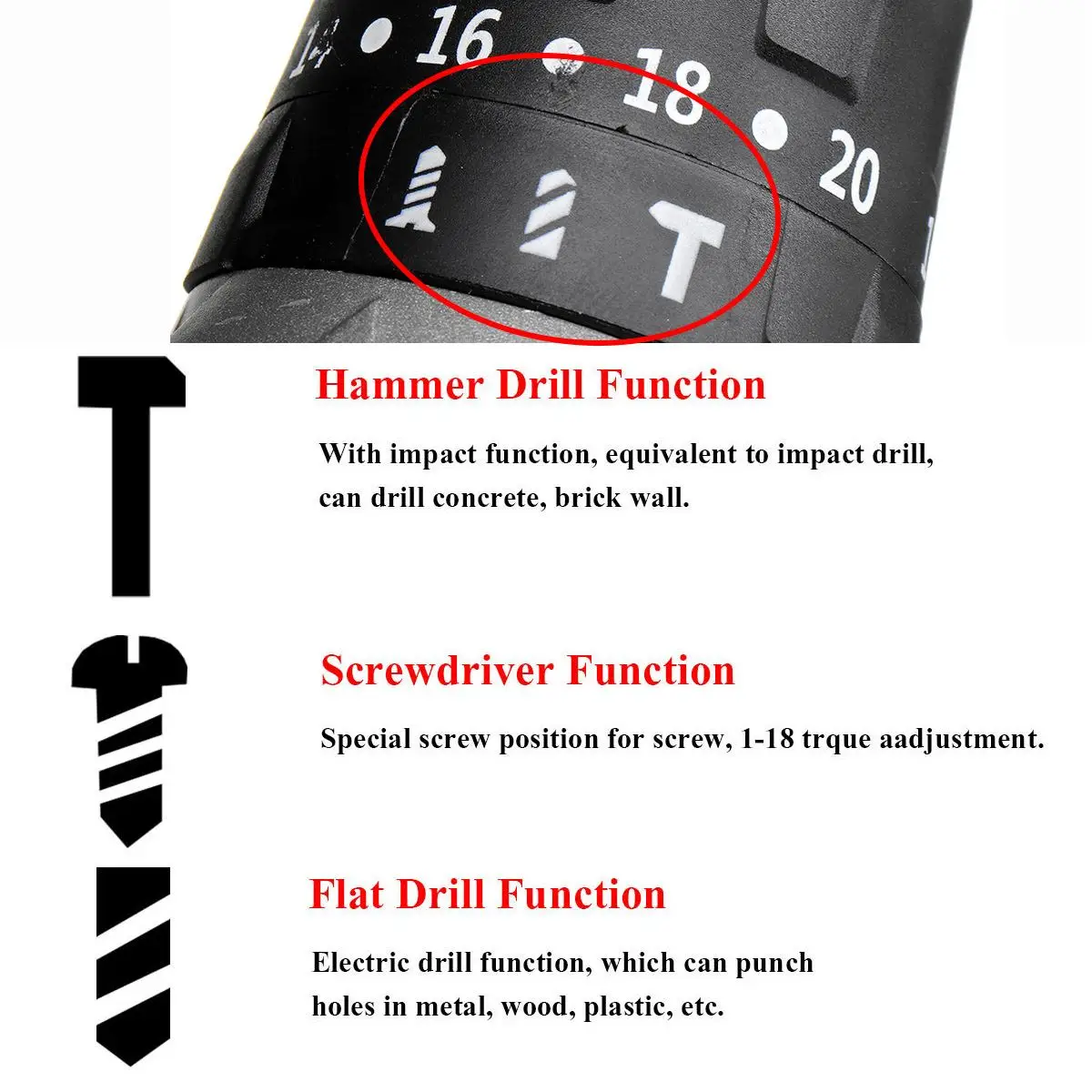 Особенности:-Эргономичная ручка обеспечивает идеальный баланс и контроль инструмента.-Функция сверления молотка 3 в 1/функция отвертки/функция плоского сверла.-Светодиодный Светильник обеспечивает освещение в темных местах во время работы.-Питание от литий-ионной аккумуляторной батареи обеспечивает более длительное время работы и большую мощность.-Переключатель вперед/назад/замок, поддержка движения вперед/назад и безопасная блокировка.-20 + 3 режима, обеспечивает 20 режимов крутящего момента и 3 режима сверления Для высокоточной работы.