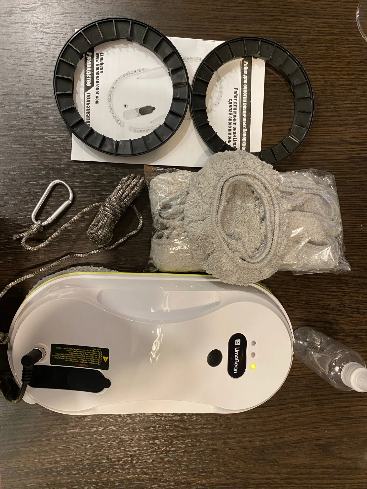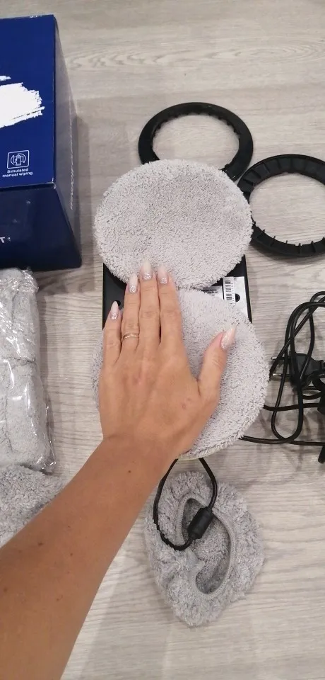 Пришёл быстро, отличный робот сам распыляет жидкость, в комплекте инструкция на русском, 12ть насадок тряпок, дополнительные диски, длинный шнур. Сразу помыла зеркало, с первого раза были ворсинки на стекле но после второго прохода без распыления жидкости все отлично