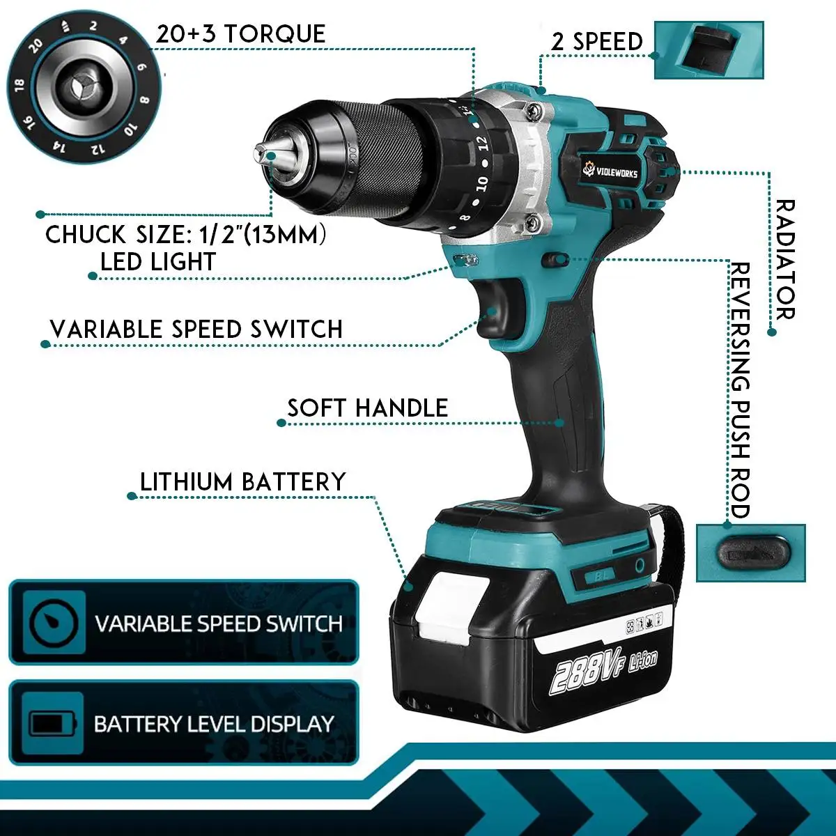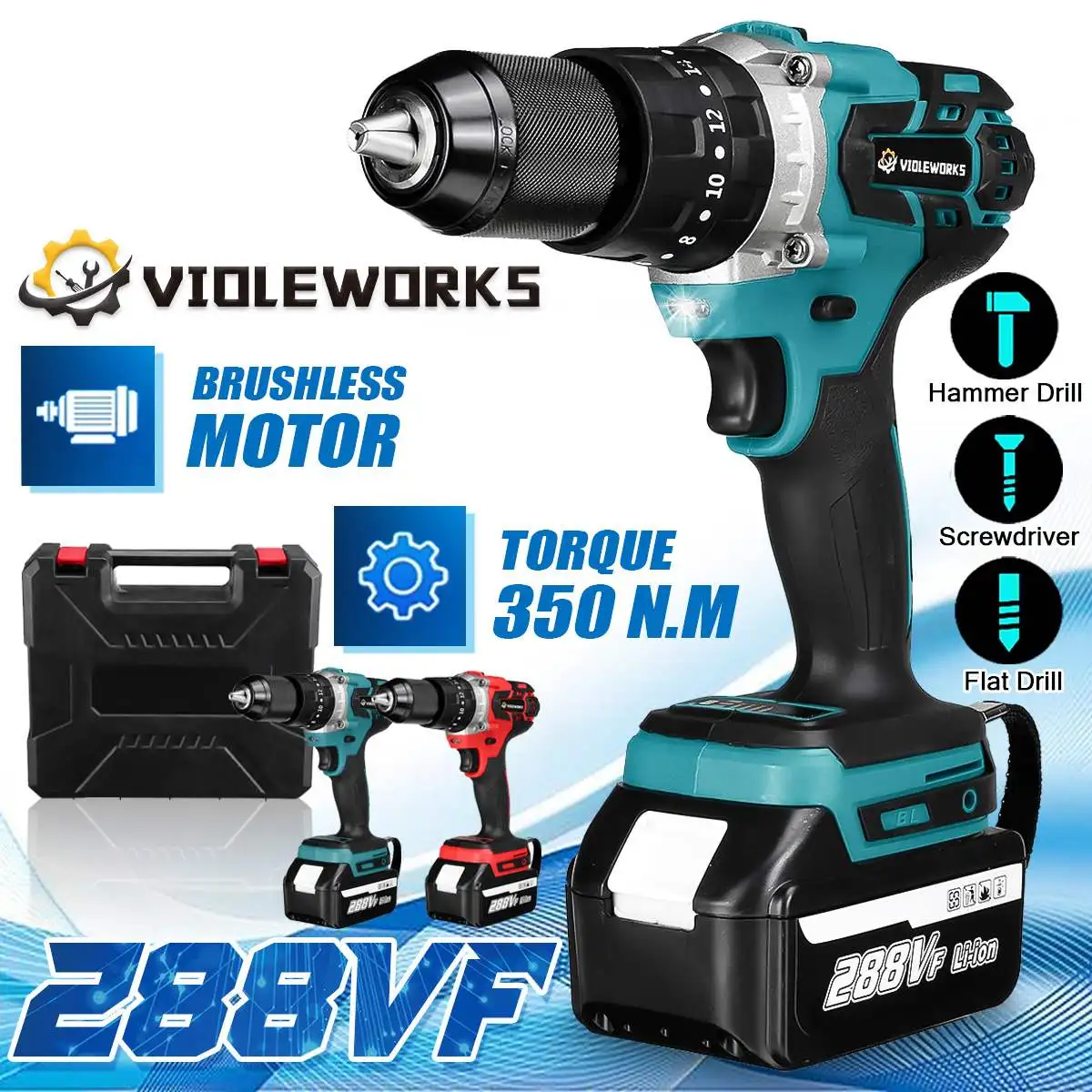 Бренд: VIOLEWORKSНазвание: Беспроводная Дрель 288VFМотор: бесщеточныйКрутящий момент: 350 Н. МБез скорости нагрузки: 4000 об/минРазмер патрона: 1/2 "(13 мм)Настройка сцепления: 20 + 3Аккумулятор: 22980 мАч3-в-1 Функция: бурильный молоток, отвертка, плоское сверлоМаксимальный диаметр сверла: Steel-13mm/ Wood-38mm/ Concrete-14mmДополнительный цвет: синий/красныйДополнительное количество батареи: 1 батарея/2 батареи
