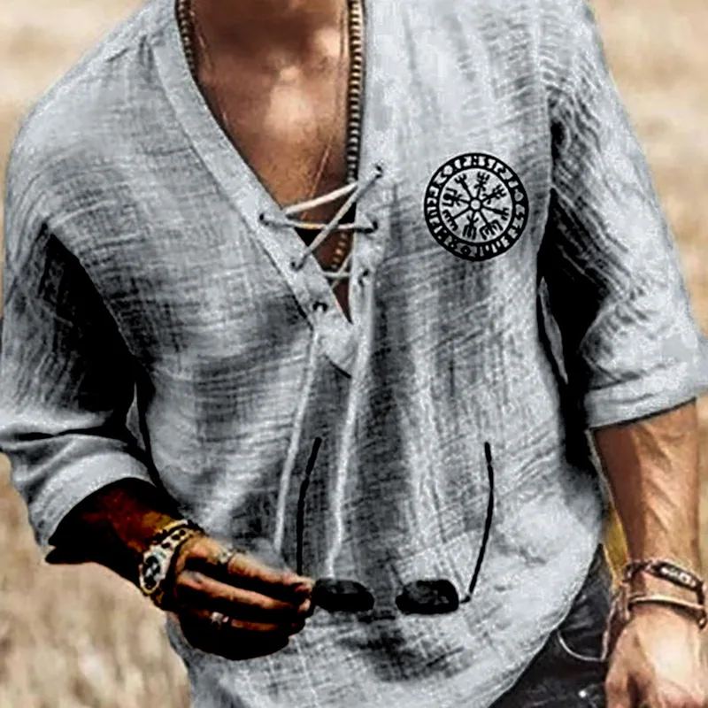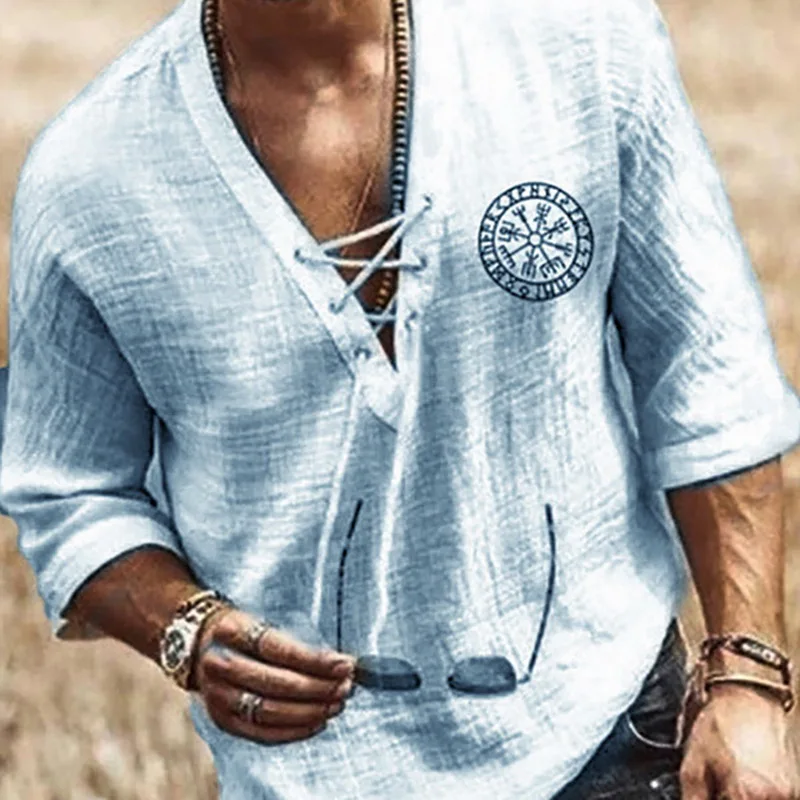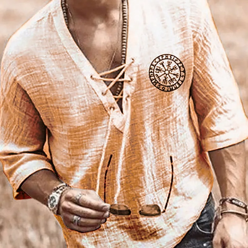 Размера плюс Мужская футболка, однотонные топы, пуловер с v-образным вырезом на шнуровке Свободный Топ, одежда для мальчиков; Сезон лето; Праздничная одежда; Одежда на Пляж Повседневный Топ с рукавом три четверти льняной Топ
