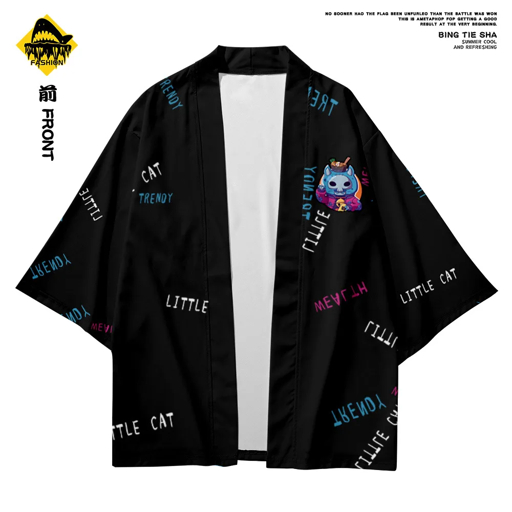 Комплект из кимоно и штанов мужской, летний Свободный кардиган в стиле Харадзюку, пальто в традиционном японском стиле, кимоно с принтом черного кота хаори