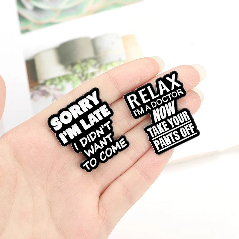 Новые творческие металлическая брошь с черными буквами на белом фоне sorry i'm late, текст эмаль украшения pin-код