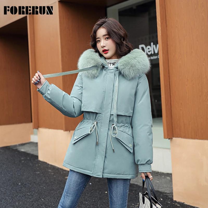 FORERUN, женская меховая парка с капюшоном, большой мех, шерсть, флисовая подкладка, тонкая талия, однотонная, зимняя, теплая, с хлопковой подкладкой, женское элегантное пальто