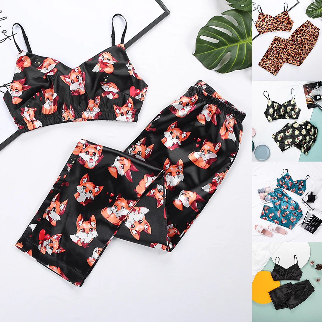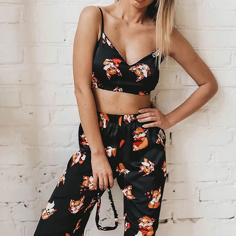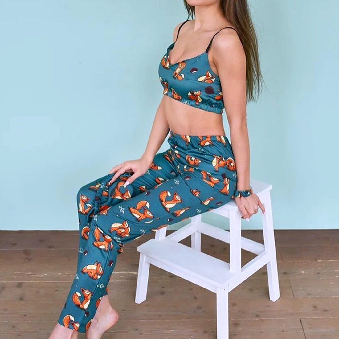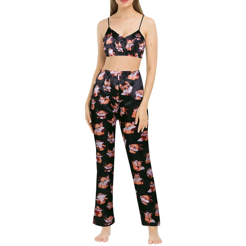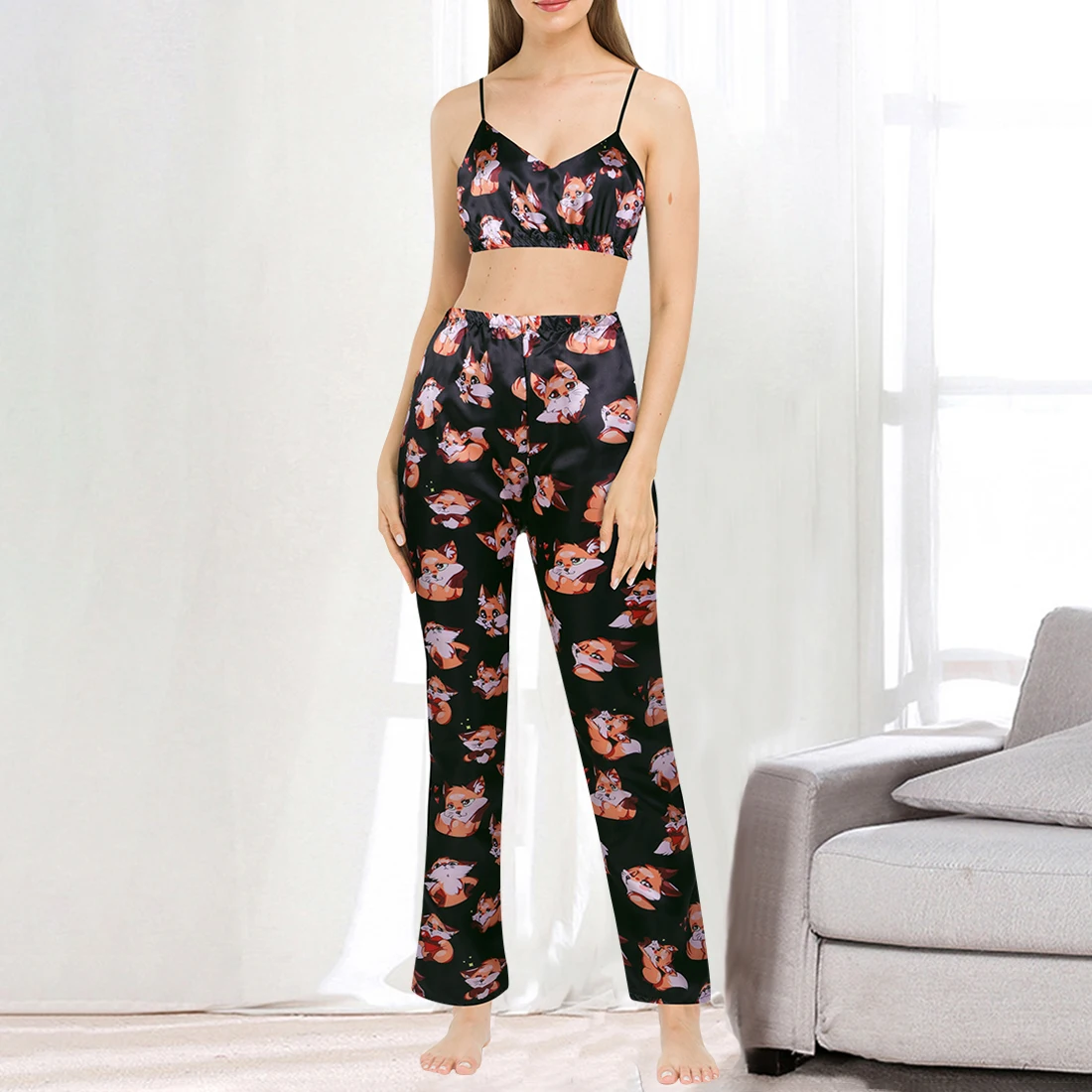 Пижама женская атласная с V-образным вырезом, комплект из двух предметов, пижама на бретелях-спагетти с принтом лисы, пикантная одежда для сна, на лето