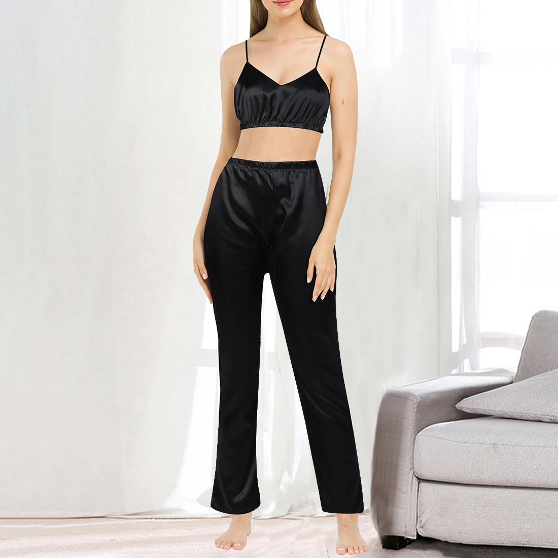 Пижама женская атласная из двух предметов, с V-образным вырезом и п...