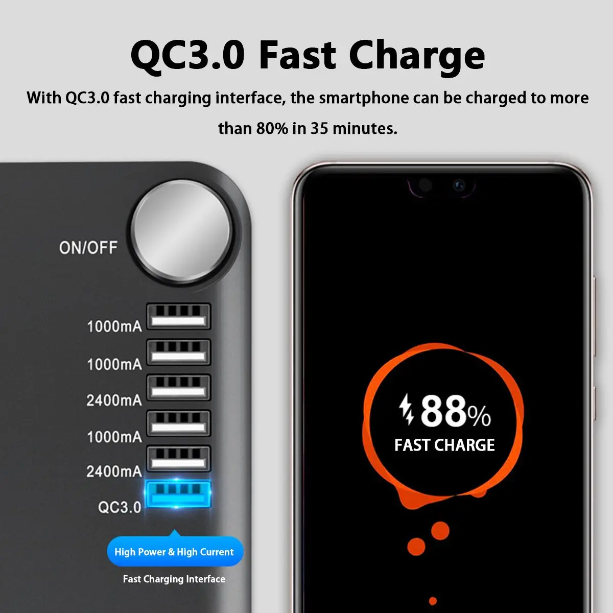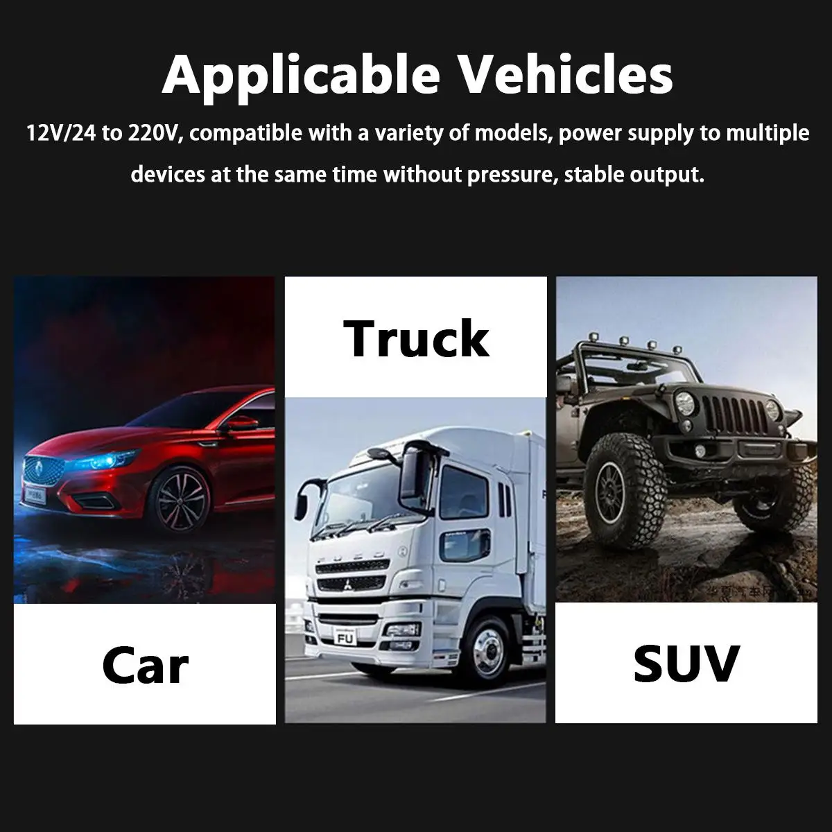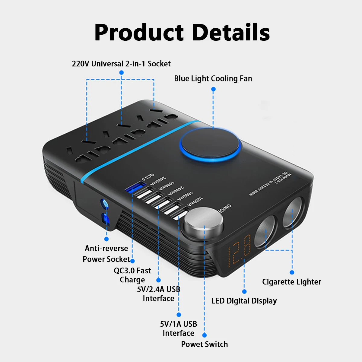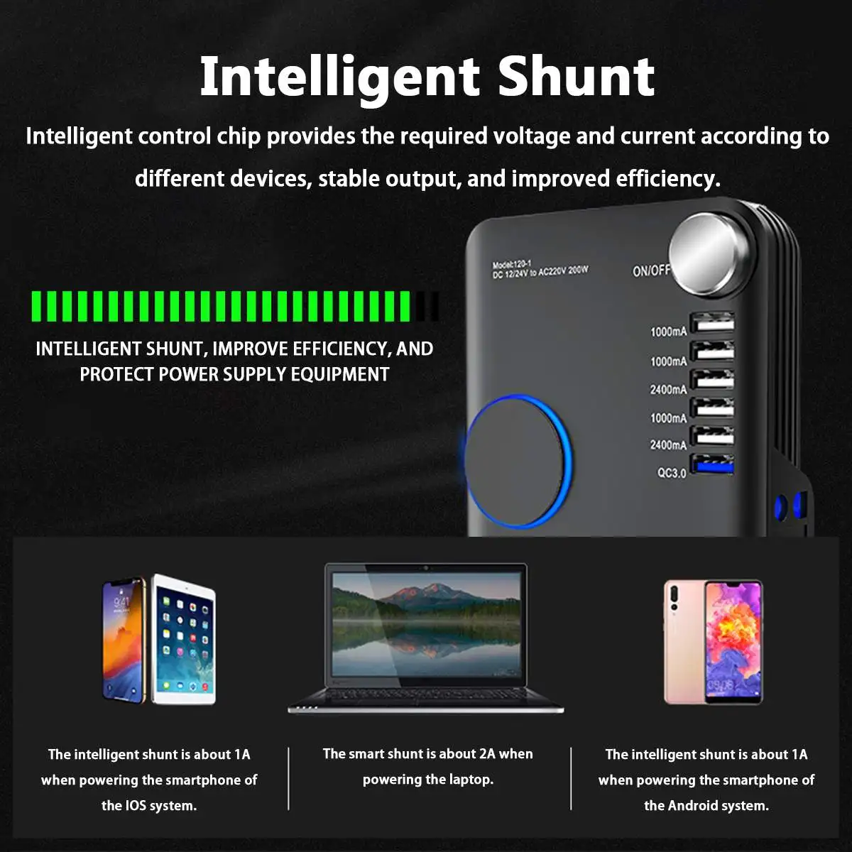 Особенности:1. Обеспечивает 200 Вт непрерывную выходную мощность постоянного тока для зарядки нескольких электронных устройств на ходу.2. 3 розетки переменного тока, 5 usb-портов для зарядки и порт быстрой зарядки QC3.0 идеально подходит для одновременного питания 9 устройств.3. Оснащена двойная зажигалка с отверстиями, которые поддерживают освещение сигарет, что более удобно в использовании.4. Интеллектуальный чип управления обеспечивает необходимое напряжение и ток в соответствии с различным оборудованием, с хорошей стабильностью выхода и улучшенной эффективностью.5. Бесшумный охлаждающий вентилятор с преобразованием частоты, интеллектуальная регулировка скорости в соответствии с температурой тела, удалением тепла и охлаждением.6. Встроенный предохранитель для защиты вашего устройства, безопасная конструкция зарядки обеспечивает защиту от, перегрева, подзарядки под и перенапряжения, короткого замыкания, перегрузки и перезарядки и т. д.7. Изготовлен из термостойкого материала ABS, легкий и портативный, компактный и компактный, безопасный источник питания в течение длительного времени.8. Отлично подходит для зарядки смартфонов, ноутбуков, планшетов, gps-устройств, телевизоров, зарядных устройств, оборудования для кемпинга и мобильного офисного оборудования.