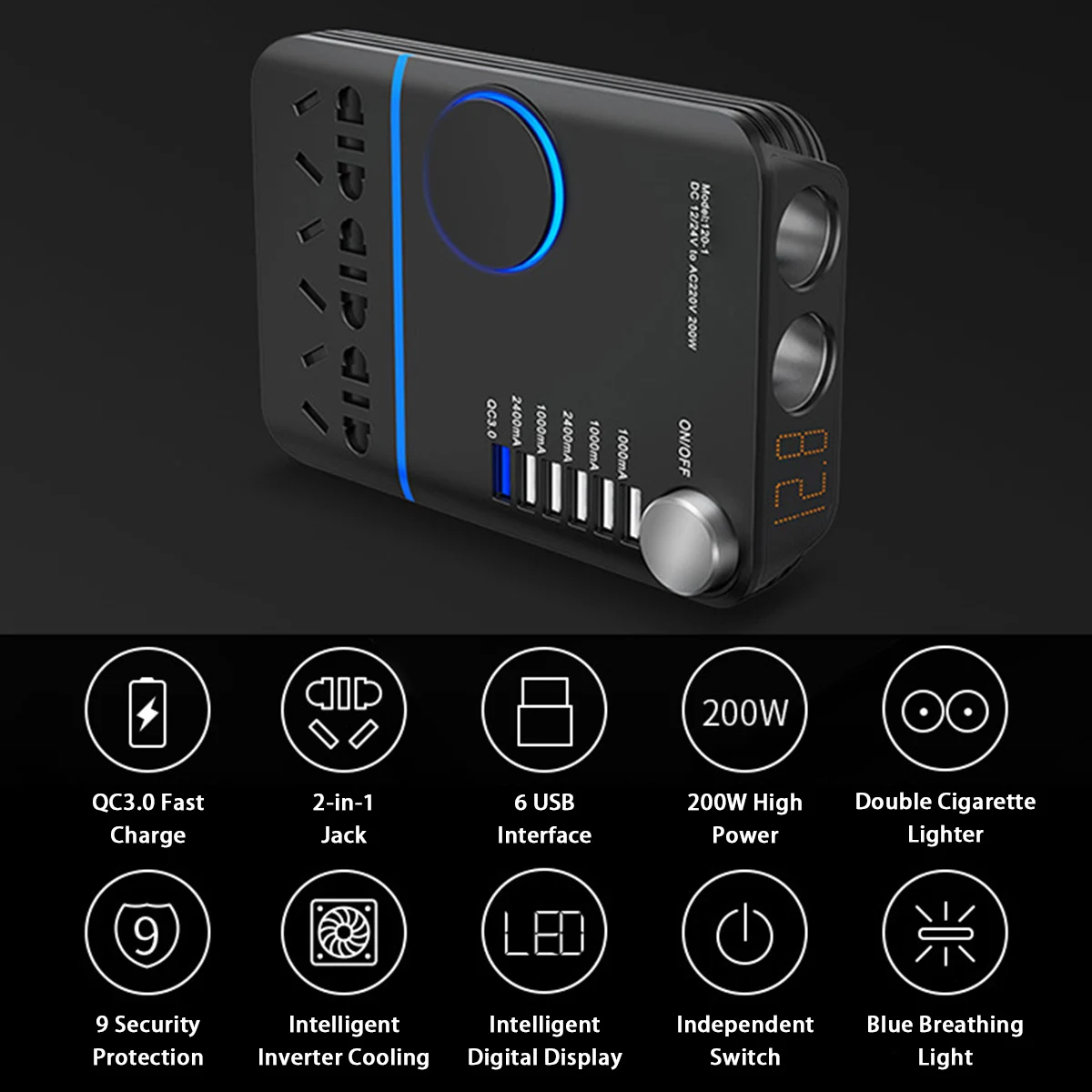 Автомобильный инвертор 200 Вт 12 В24 В до 220 В прикуриватель источник питания инвертор адаптер с QC 3,0 5 USB зарядным устройством Быстрая зарядка