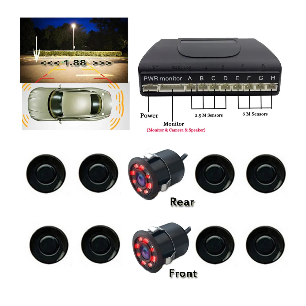 8 датчиков двухъядерный парковочный обратный радар с 2 камерами (передняя + задняя). Изображение заднего хода автомобиля и расстояние могут отображаться на ЖК-мониторе автомобиля (не входят в комплект)
