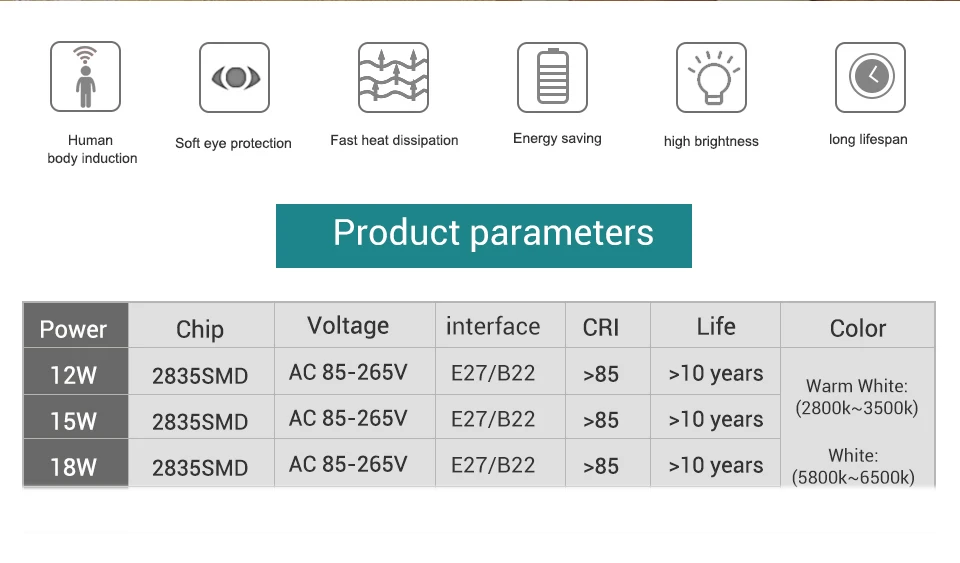 Характеристики: Тип цоколя: E27 B22 Напряжение: AC85-265V Мощность: 12 Вт 18 Вт 15 Вт Светодиодный Тип: 2835 SMD Цвет излучения: белый/теплый белый Цветовая температура: 5800-6500K/2800-3500K Материал корпуса: PC + ABS Угол обнаружения: 120 градусов Расстояние обнаружения: 3-5 метров Длительность: 40-60s Особенности: Автоматическое включение/выключение с датчиком движения PIR. Прочный и энергосберегающий, длительный срок службы. Высокая чувствительность, высокий светильник, низкое потребление Подходит для коридора, тропы, лестницы, сада, двора и т. д. Посылка: 1x светодиодный светильник с датчиком движения PIR