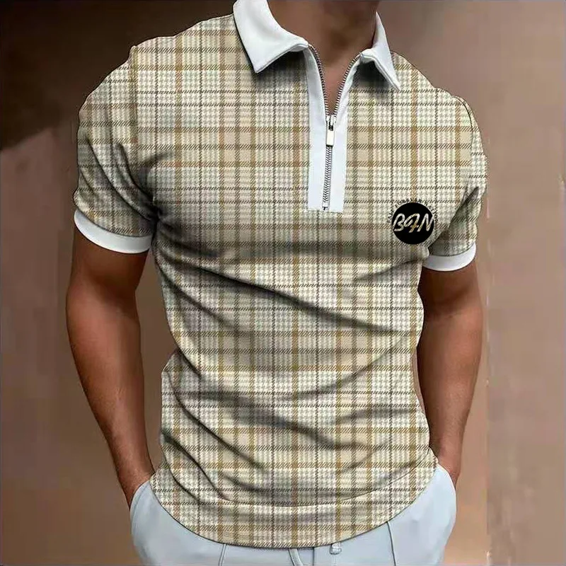 Рубашка-поло мужская клетчатая с коротким рукавом, отложным воротником и молнией