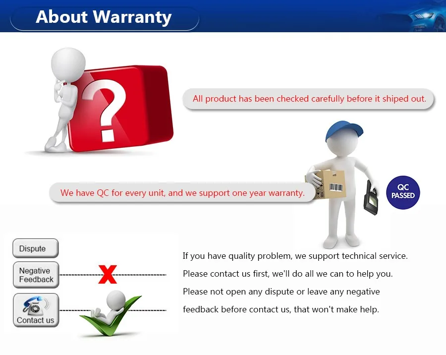 Предупреждение:Перед размещением заказа покупатель должен ознакомиться с информацией о способе доставки, это очень важно!-- Если покупатель выбирает способ доставки, который отслеживает знак×,Это означает, что посылка не будет иметь информацию об отслеживании деталей, Как правило, есть только информация о доставке на склад.-- Если вы не можете получить посылку после60 дней, Пожалуйста, свяжитесь с нами дляУдлинениеВЗащита времени доставки.-- Если все еще не смогли получить его после90 дней, Затем может открыть спор, мы обещаем, чтоВозврат средств,Вы не будете иметь никаких потерь.-- ПожалуйстаБудьте терпеливыЧтобы дождаться вашей посылки, не открывайте спор, если вы не можетеПолучите его в течение 90 дней. Спасибо за понимание!-- Если вам нужен номер отслеживания для проверки позиции посылки.Пожалуйста, выберите AliExpress стандартную доставкуОтслеживание√Будет небольшая дополнительная стоимость доставки.