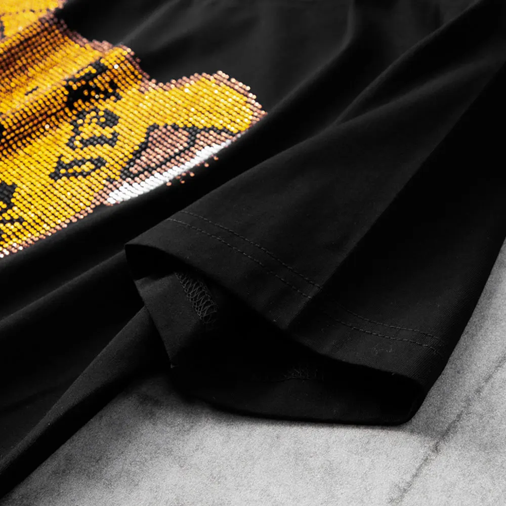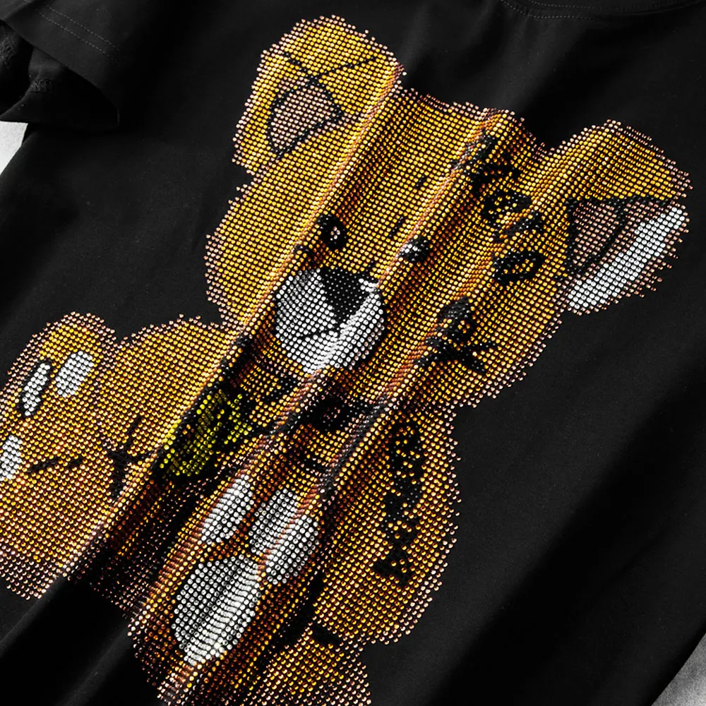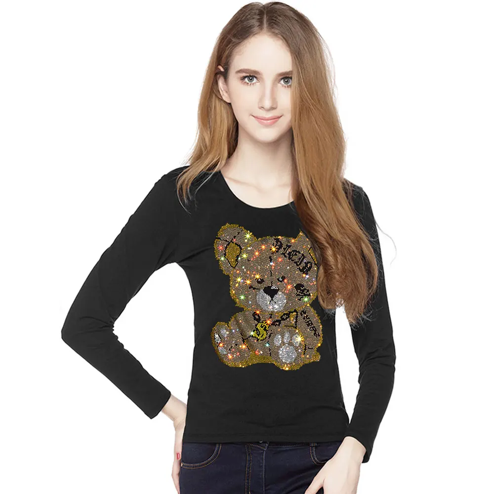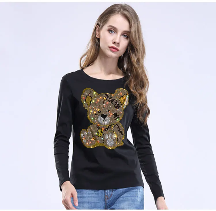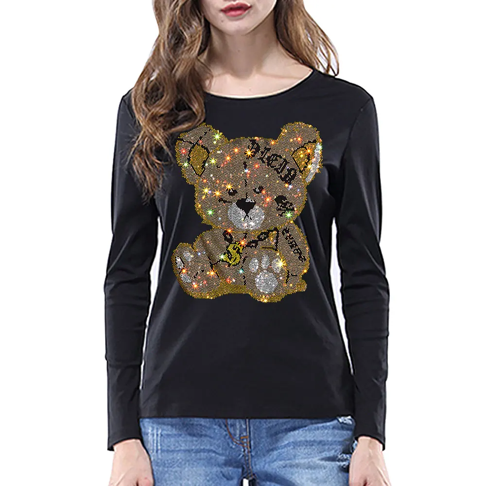 Женские футболки Harajuku для девочек размера плюс, топы с надписями, стразы, круглый вырез, длинные рукава, свободная летняя футболка, белые футболки с медведем, S-5XL