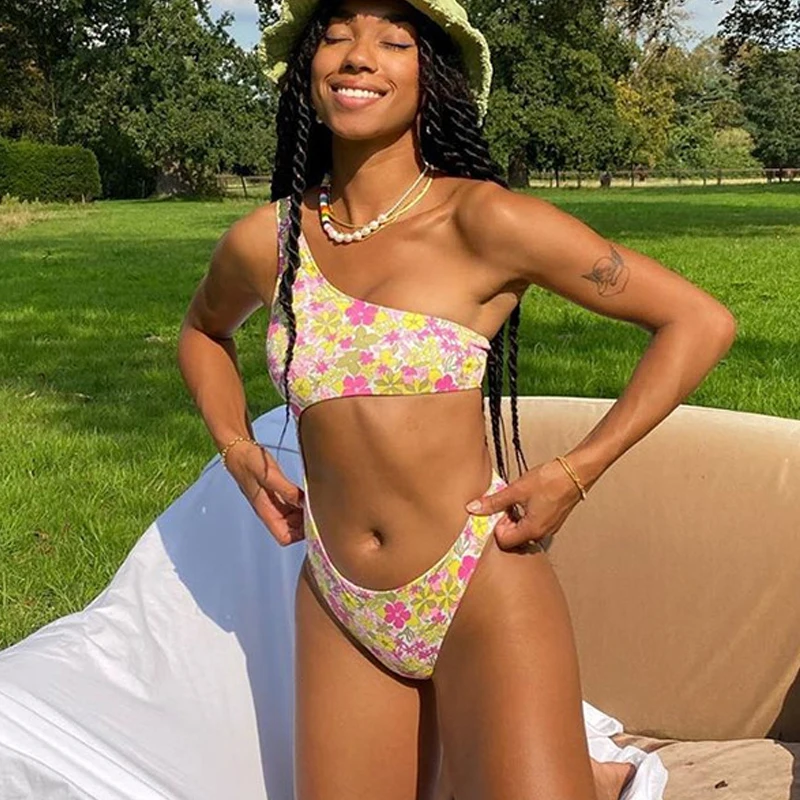 Сексуальный купальник на одно плечо, женский слитный купальник с цветочным принтом, монокини с вырезами для живота 2021, Женское боди, пляжная одежда для плавания