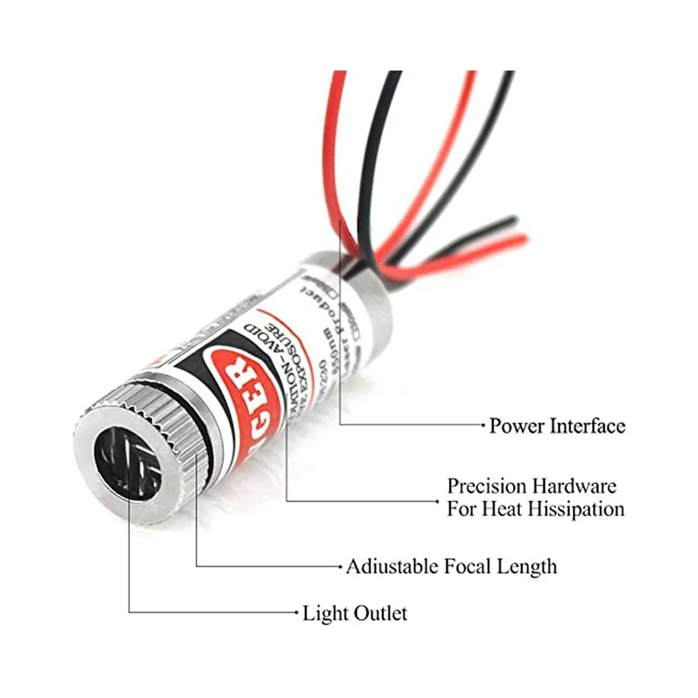 Длина волны: 650 нмВыходная мощность: 5 мВтРабочее напряжение: 3-5 ВРабочий ток: I < 45mAРабочая температура: + 15 ℃ ~ + 35 ℃Форма лазера: линия (по умолчанию 120 градусов)Фокусируемый: ДаОтклонение: ≤ 2 (мм) при 1 мМатериал: металлРазмеры: 12x30 мм