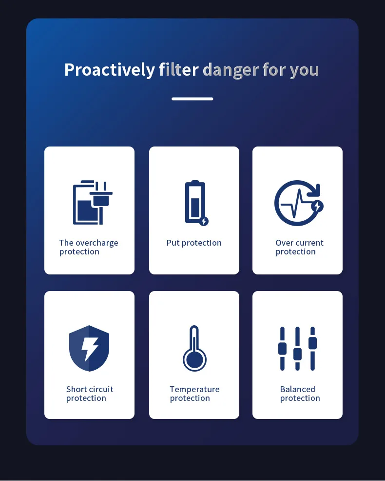 ②Защита от перезаряда/Защита от перегрузки по току/Защита от температуры/Защита от короткого замыкания/функция баланса