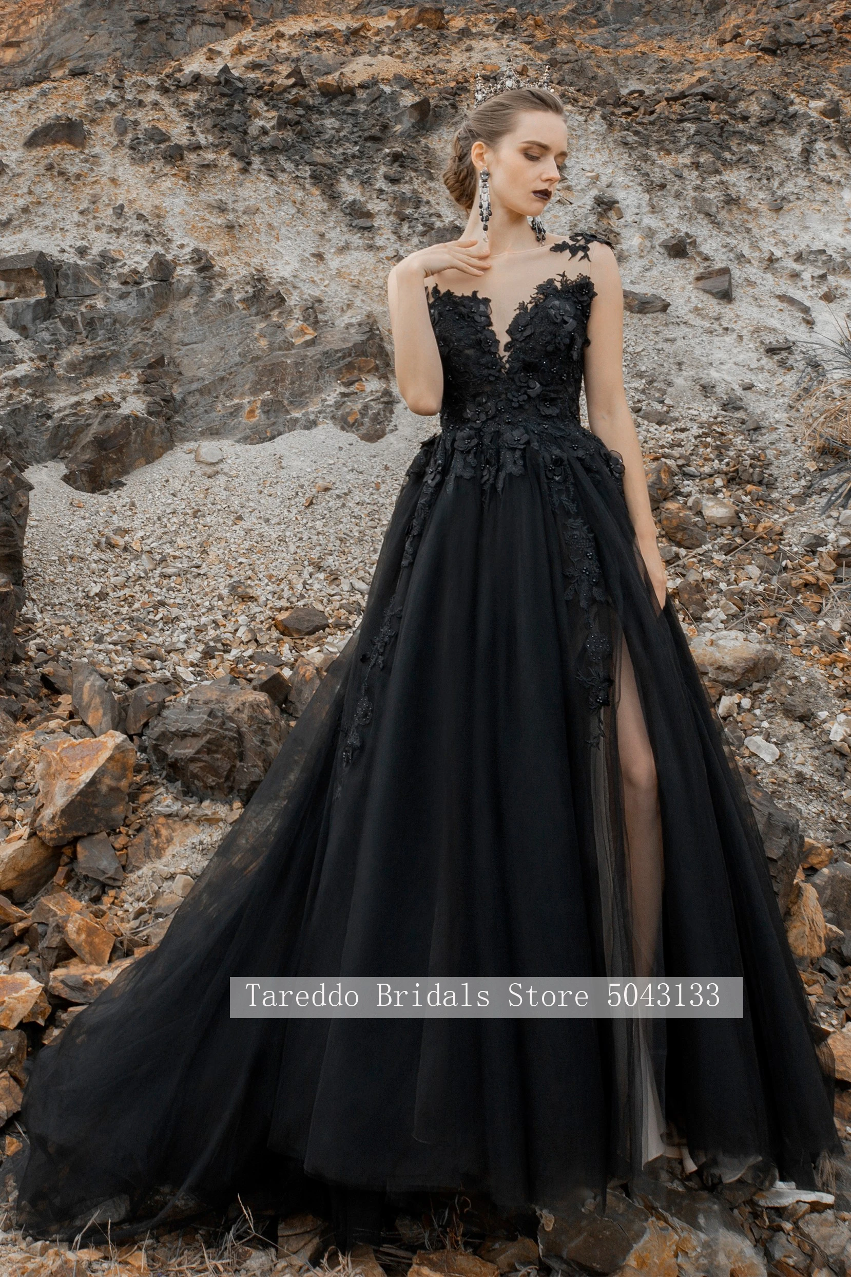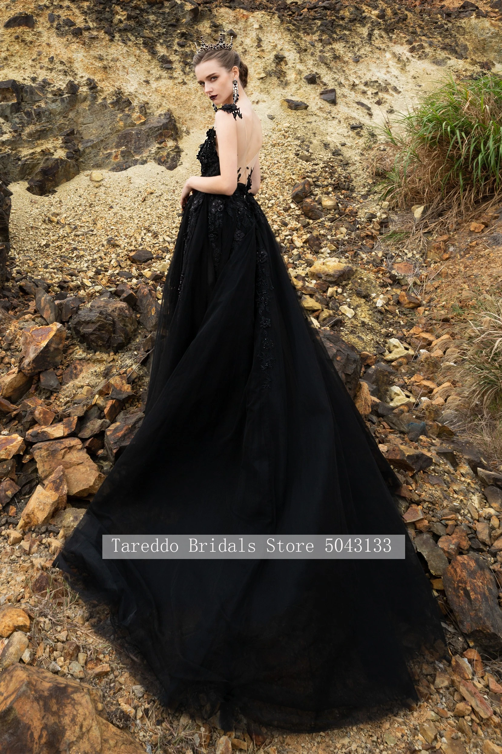 Винтажное черное Тюлевое свадебное платье, Кружевная аппликация, Цветочная аппликация ручной работы, ТРАПЕЦИЕВИДНОЕ свадебное платье с открытой спиной и длинным Боковым Разрезом, 2022