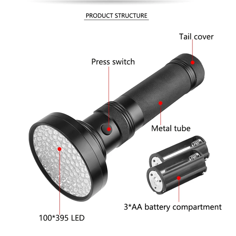 100 шт. 395 светодиодная УФ-лампа, корпус из алюминиевого сплава 6 шт. батарея аа.Характеристики: