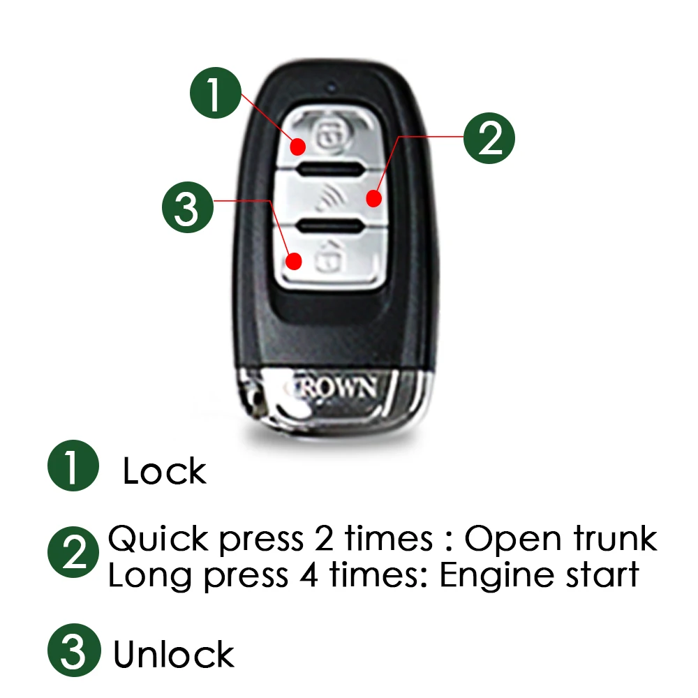 Особенности продукта:1. Автоматическая блокировка/разблокировка мобильный телефон2. Кнопка блокировки/разблокировки телефона3. Откройте функцию задней коробки (она может работать только в том случае, если задний ящик автомобиля питается от электричества)4. Ищите навыки автомобиля5. Заблокируйте свой автомобиль6. Пульт дистанционного управления для запуска/остановки автомобиля7 .. Функция запуска одной кнопкой8. Функция блокировки9. Функция сигнализации боковой двери10. Функция отключения звука при мытье автомобиля11.PKE Индукционная Удобная Входная функцияПрименимые модели:1. Подходит для автомобилей 12 В2. Не подходит для моделей Buick, Mercedes-Benz, BMW, Volkswagen и других моделей высокого класса, другие модели могут быть установленыПримечание:1. Выход продукта по умолчанию является отрицательным полюсом при выходе из фабрики. Если автомобиль имеет положительный полюсный выход, необходимо установить два реле 12 В, чтобы он мог нормально работать.2. Пульт дистанционного управления этого продукта не содержит батарей. Пожалуйста, покупайте самостоятельно3. Если у оригинального автомобиля есть кнопка пуска одной кнопкой, его необходимо заменить на нашу кнопку пуска перед операцией.