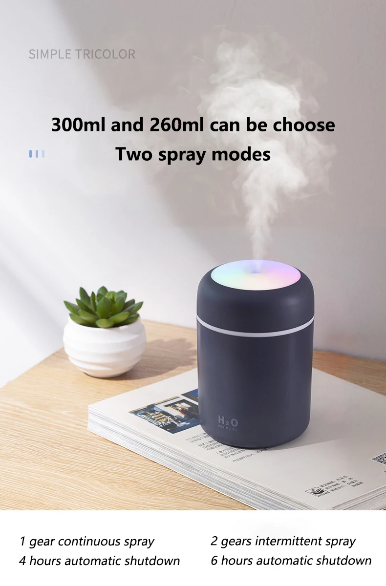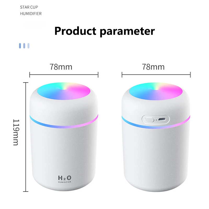· Красочный светодиодный ночной Светильник· 300 мл и 260 мл· Низкий уровень шума 30 дБ· Распылитель: 30-45mlH· Запланированное время Отключения: 4h & 6h· 78*78*119 мм и 72*72*128 мм