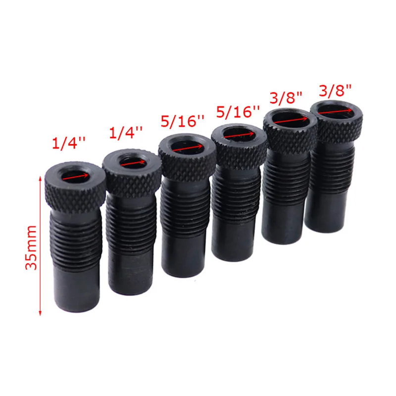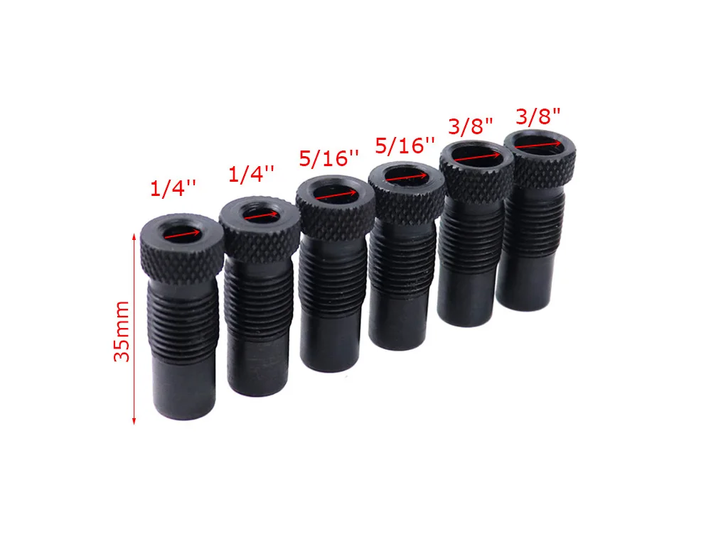Предусмотрены шесть закаленных стальных втулок; По два в 1/4 дюйма, 5/16 дюйма и 3/8 дюйма