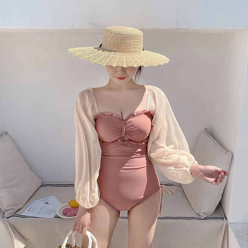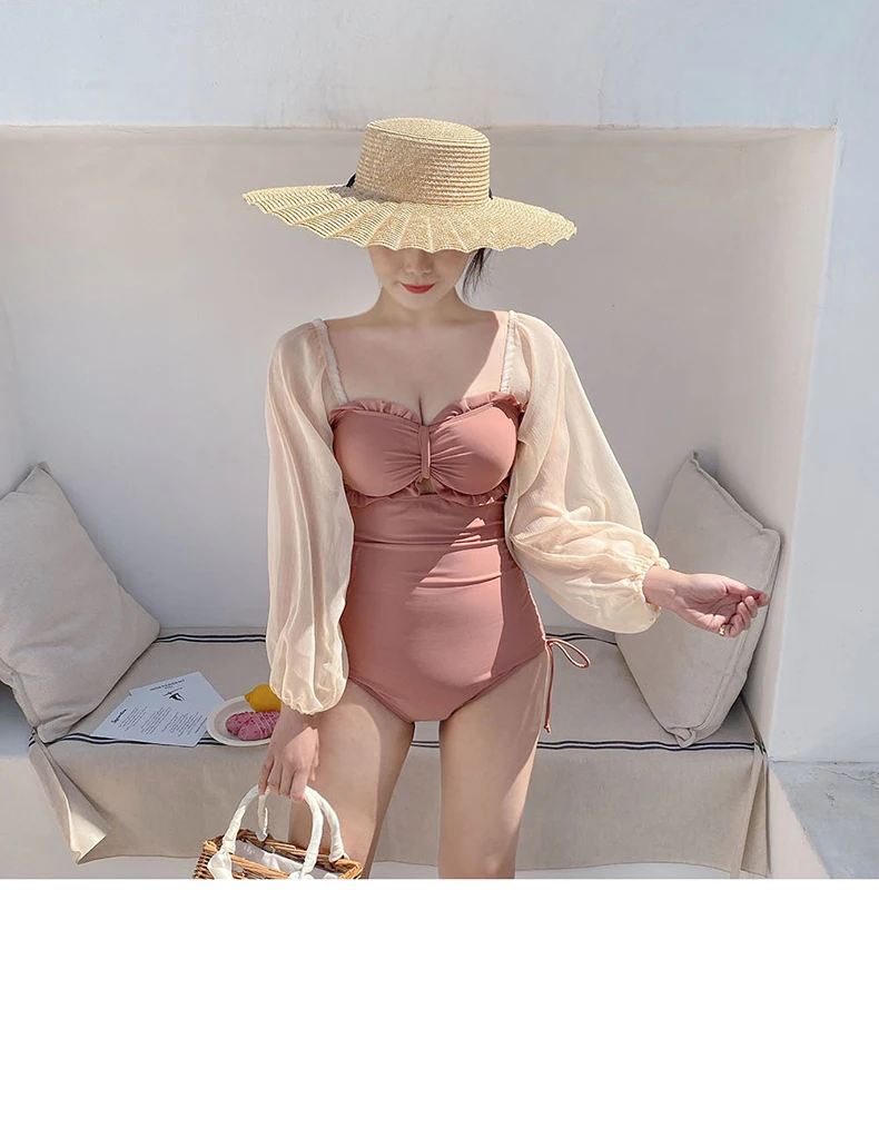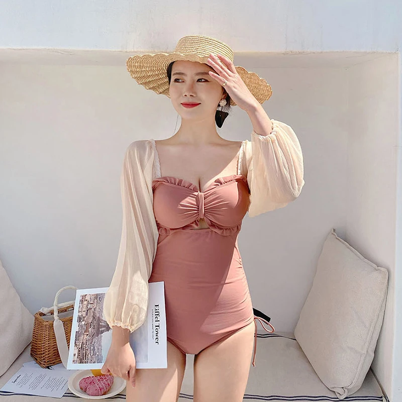 Женское Монокини, Цельный купальник с длинными рукавами-фонариками, однотонный купальник с низким вырезом, пляжная одежда в Корейском стиле с оборками и подкладками, 2021
