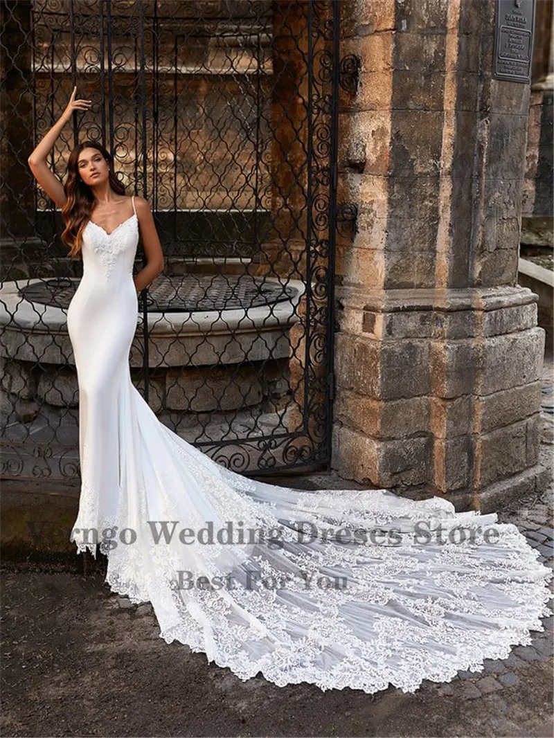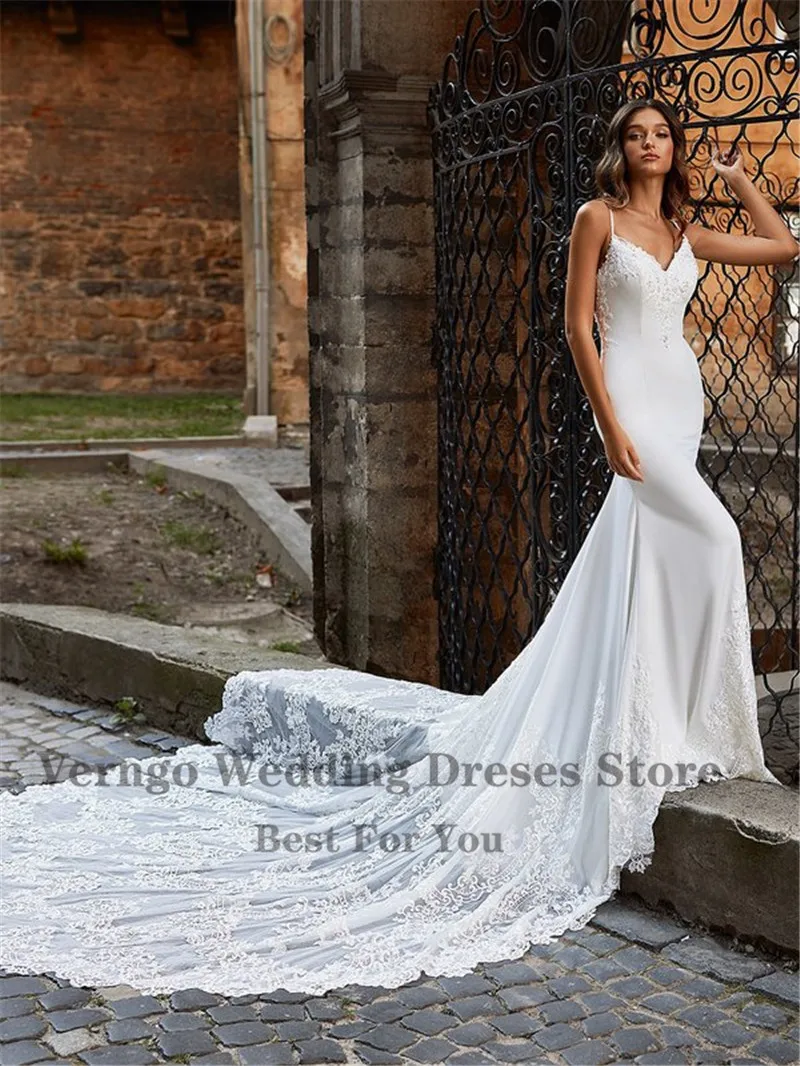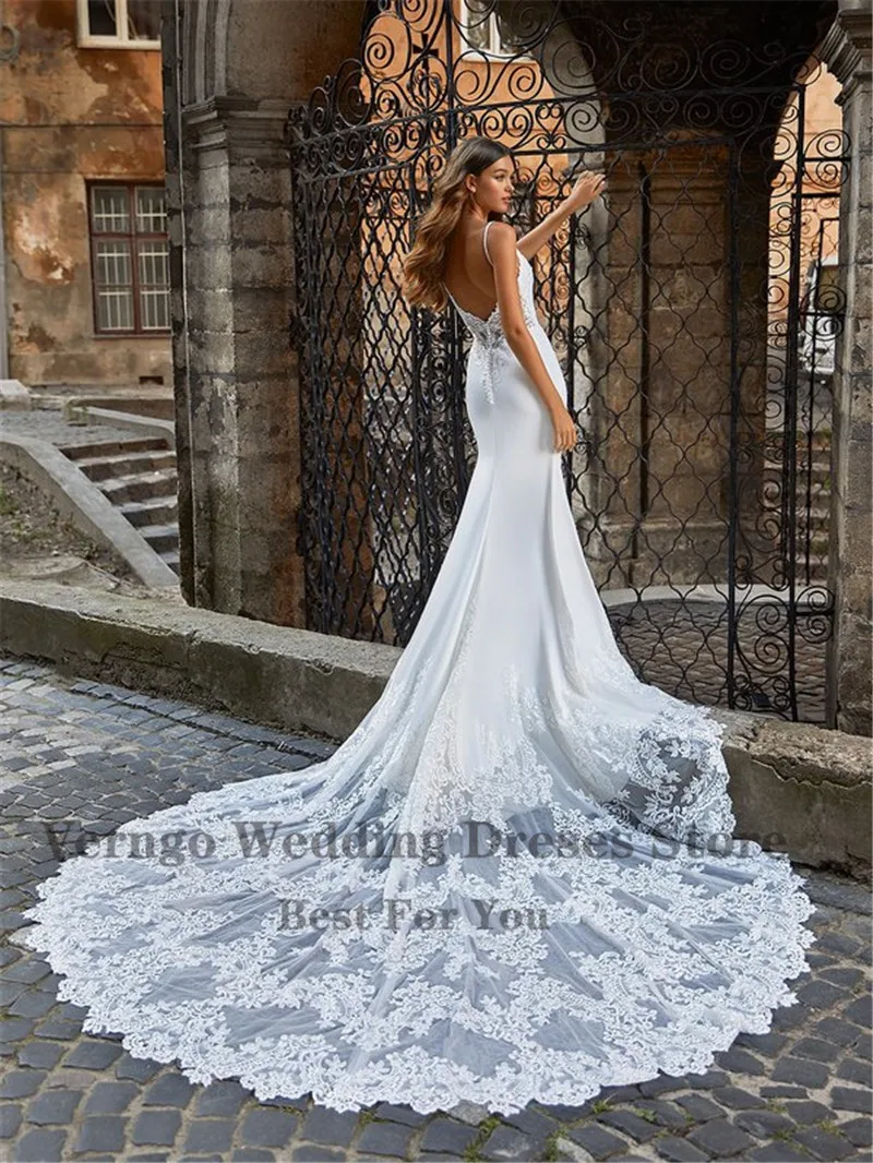 Платье свадебное с кружевной аппликацией, длинным шлейфом и низкой спиной