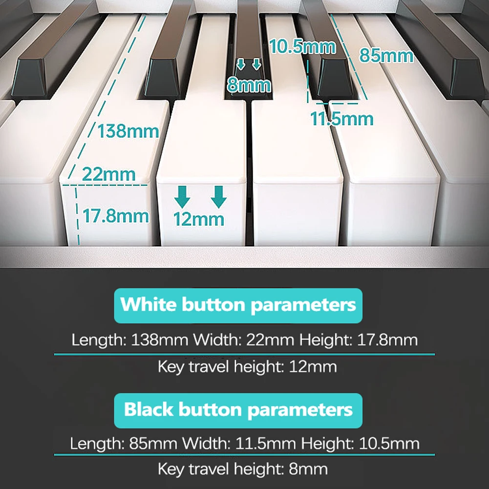 Изготовлен из высококачественного поликарбоната, практичный.BT, функция регулировки движения может быть настроена на звук музыкальной клавиатуры.Внешние интерфейсы включают MP3, гарнитуру/аудио, педаль, аудиовход, микрофон, usb-интерфейс питания/MIDI OUT.88 полноразмерных клавиш имитируют ощущение r-eal фортепиано.Функция записи и воспроизведения, удобная для записи вдохновения в любое время.Многофункциональная Панель управления имеет ультратонкий дизайн, более тонкий и компактный.Педали отвечают требованиям профессиональных представлений.Нескользящий коврик, играющий на пианино более стабильно и не царапайте стол.Характеристики:Цвет: черный, белый (по желанию)Материал: ABS + PCВыходная мощность: 2*2 Вт 4ΩБатарея: 3,7 V, 1750mAhТон: 128Ритм: 128Демонстрация: 15Белый размер ключа: 138*22 ммЧерный-размер ключа: 85*11,5 ммБелый клавишный ход: 12 ммЧерный клавишный ход: 8 ммАккумулятор: 5 В, 2000 мАчРазмер посылка: 700*270*175 мм/27,6*10,6*6,9 дюймовВес посылка: 5850 г/12,9 фунтовУпаковочный лист:1 * электронное пианино1 * USB кабель1 * Руководство пользователя1 * сумка для пианино1 * поддерживающая педаль1 * музыкальный стенд