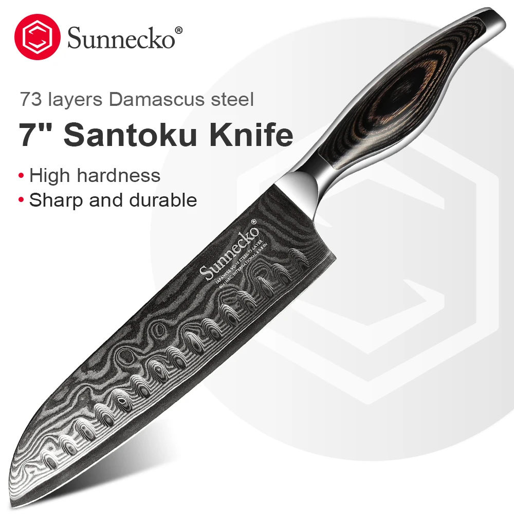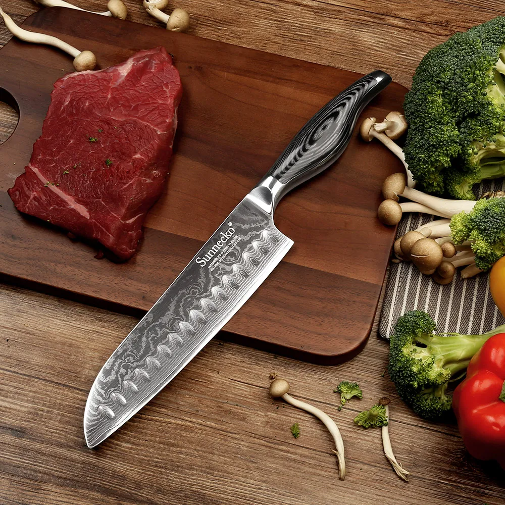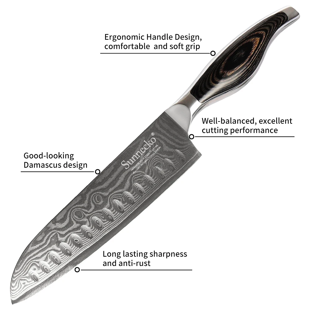 Кухонный нож сантоку из дамасской стали Sunnecko 7 дюймов, японская бритва с деревянной ручкой Pakka VG10, острые лезвия, ножи для резки мяса