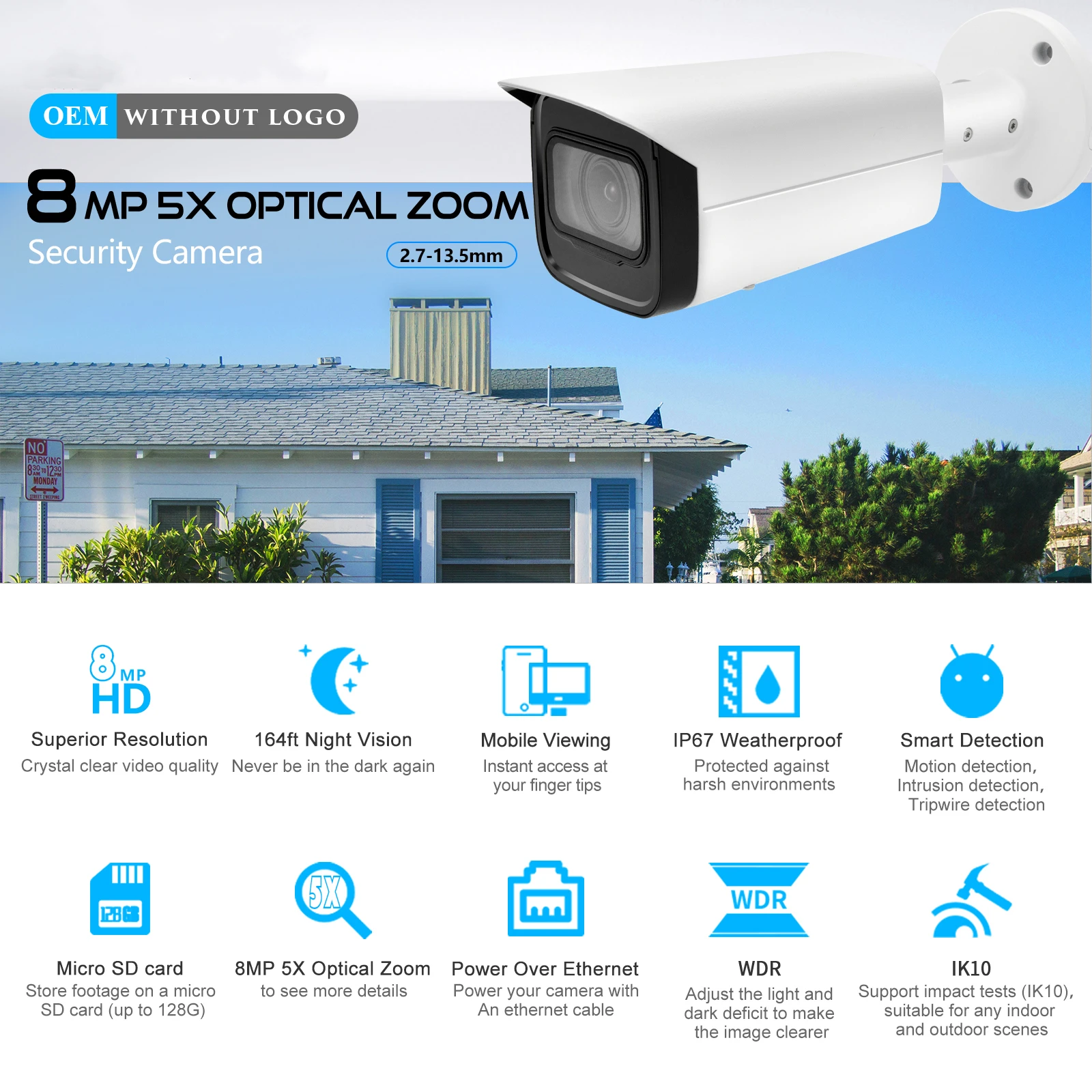 > Выходы Макс. 8MP (3840 × 2160) @ 15 кадров в секунду, и поддерживает 2688 × 1520 @ 25/30 кадров в секунду> H.265 кодек, высокая степень сжатия, ультра-низкая битрейт> Встроенный ИК-светодиодный, максимальное ИК-Расстояние: 60 м