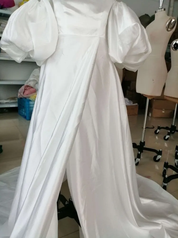 Платье свадебное атласное со съемными пышными рукавами и Боковым Ра...