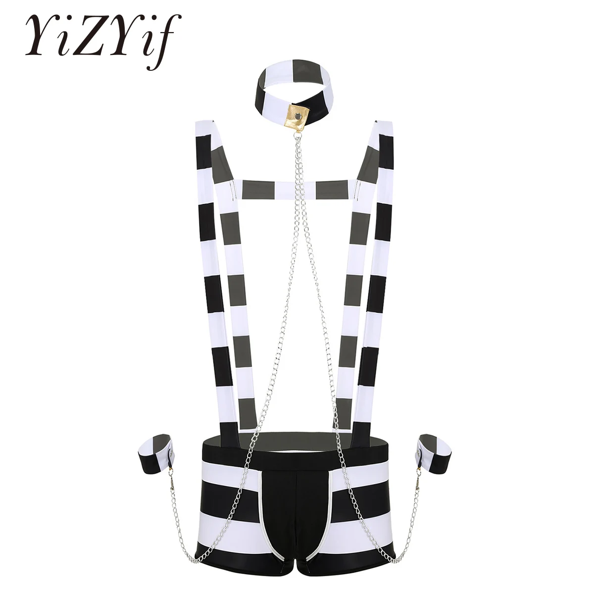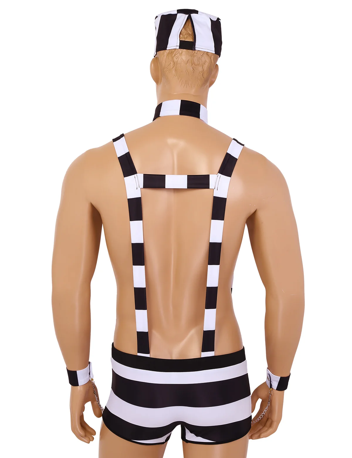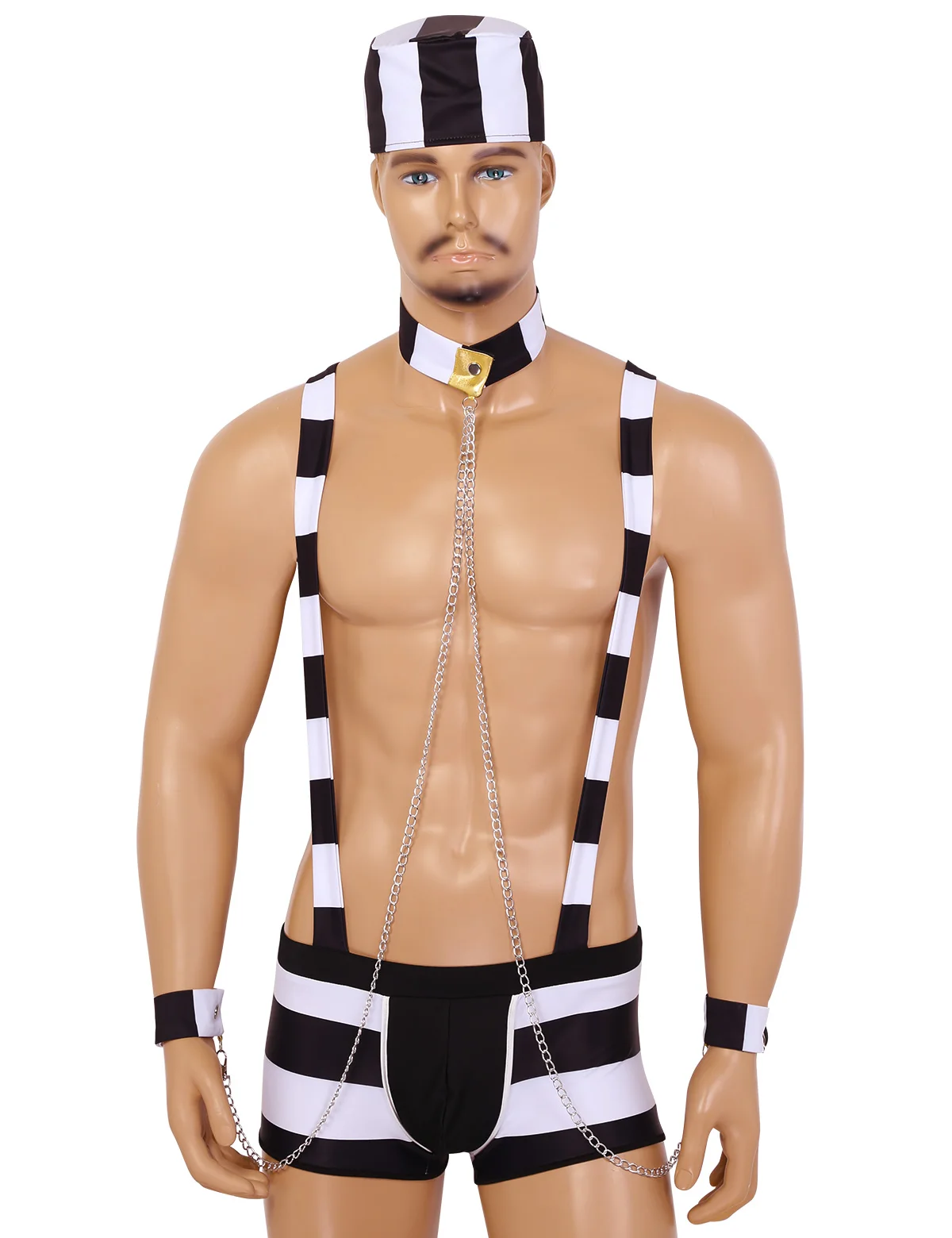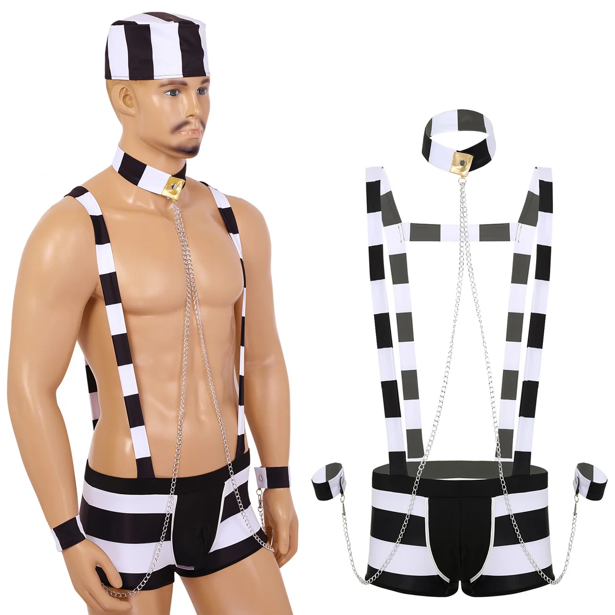 # M-XXL, 4 шт., мужской костюм для взрослых, костюм заключенного для ролевых игр, костюм на Хэллоуин, комплект нижнего белья, полосатые трусы-боксеры на подтяжках с воротником и шапкой, браслеты