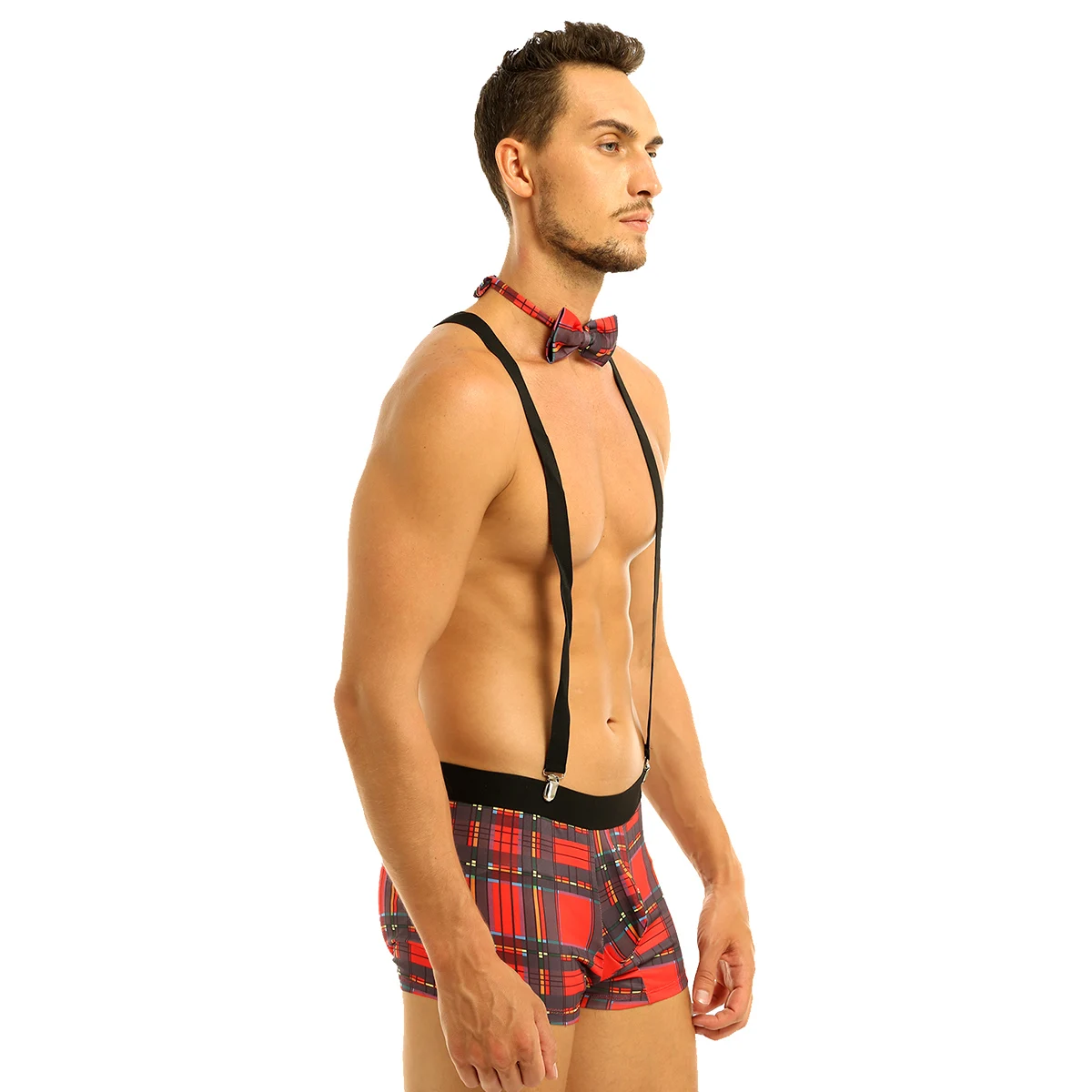 Особенности:Мужской комплект нижнего белья для взрослых, трусы-боксеры с подтяжками и бантом, особый дизайн.Нижнее белье с удобным эластичным поясом, клетчатым узором, спереди с объемным мешочком, мягкая и удобная посадка.Эластичные y-образные подтяжки с 3 металлическими прочными зажимами для подключения ваших трусов-боксеров. Клетчатая галстук-бабочка с длинными лямками сзади.Идеально подходит для костюмированной вечеринки, клубной одежды, одежда в стиле Рейв, вечерние, белье для ночного белья и само-удовольствие, сделает вас более привлекательными.Пожалуйста, внимательно проверьте таблицу размеров перед покупкой, ручная и машинная стирка в холодной воде.