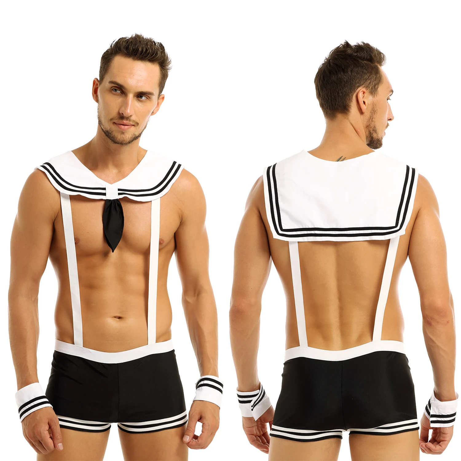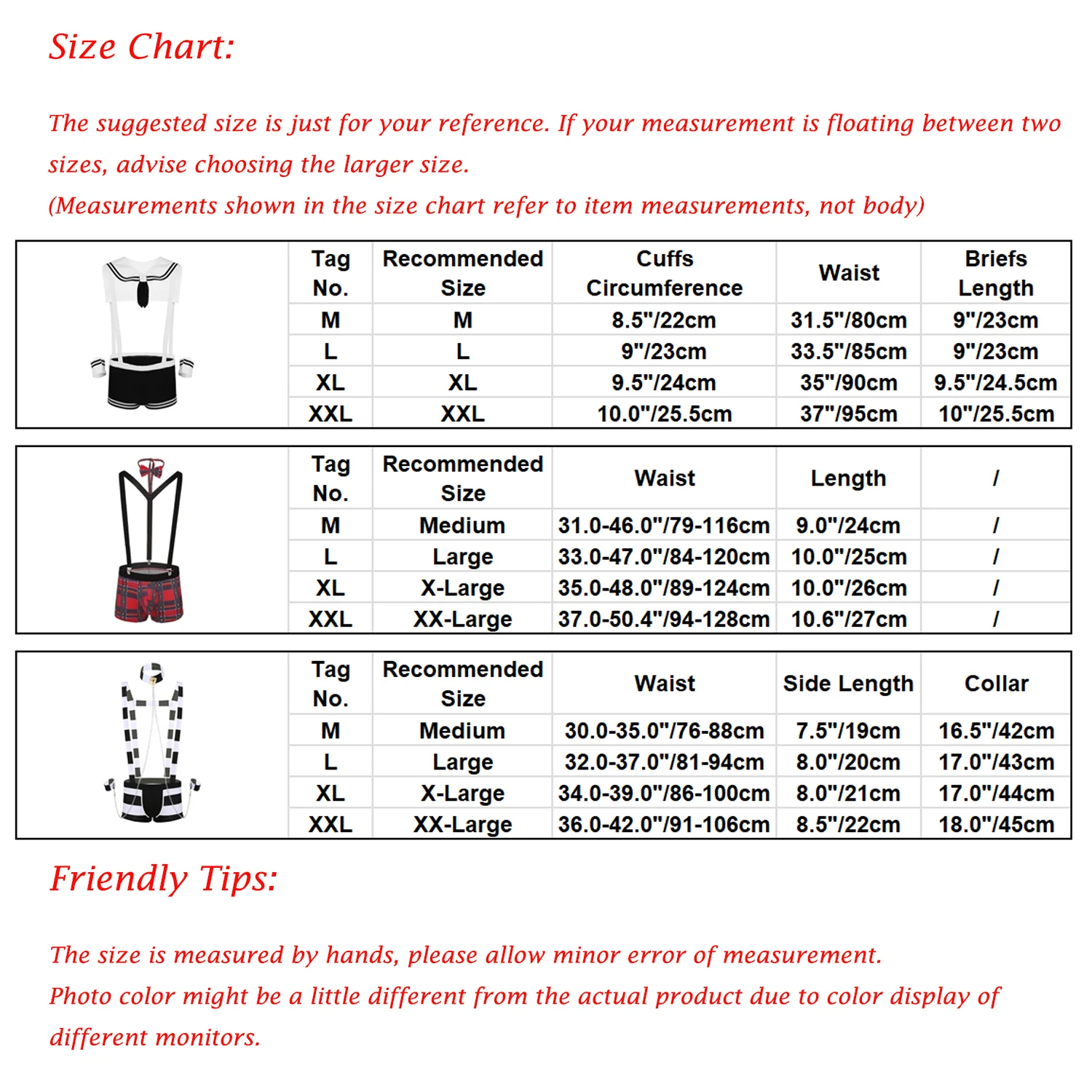 Особенности:Мужское нижнее белье для взрослых, трусы-боксеры, комплект нижнего белья для костюма cosply.Удобный эластичный пояс и эластичные подтяжки, дизайн матросского воротника.Хорошая эластичная ткань, дышащая, мягкая и удобная посадка.Идеально подходит для костюмированной вечеринки, клубной одежды, одежда в стиле Рейв, вечерние, белье для ночного белья и само-удовольствие.Пожалуйста, внимательно проверьте таблицу размеров перед покупкой, ручная и машинная стирка в холодной воде.