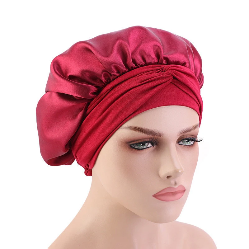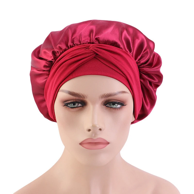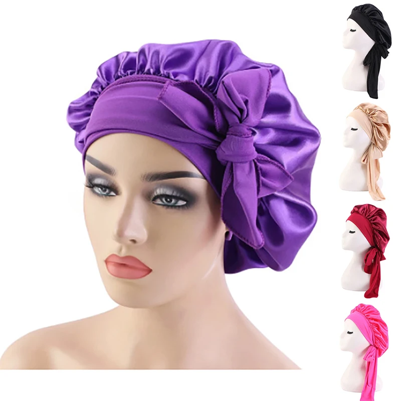 Шапочка для ночного сна с длинными волосами, шелковая шапочка для укладки волос, однотонная Атласная шапочка для взрослых с широкими эластичными завязками