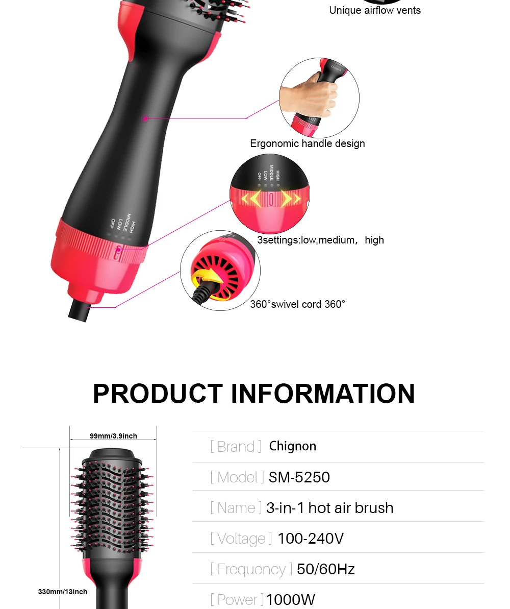 1000 Вт одношаговый фен, объемный электрический фен, фен с горячим воздухом, щетка, выпрямитель для волос, плойка, расческа, фен и стайлер