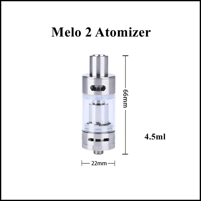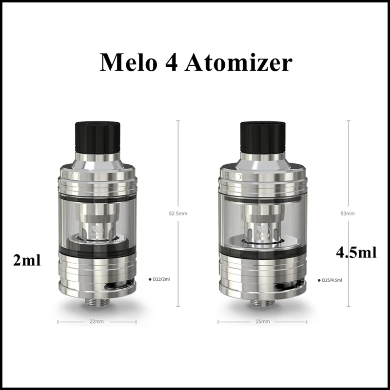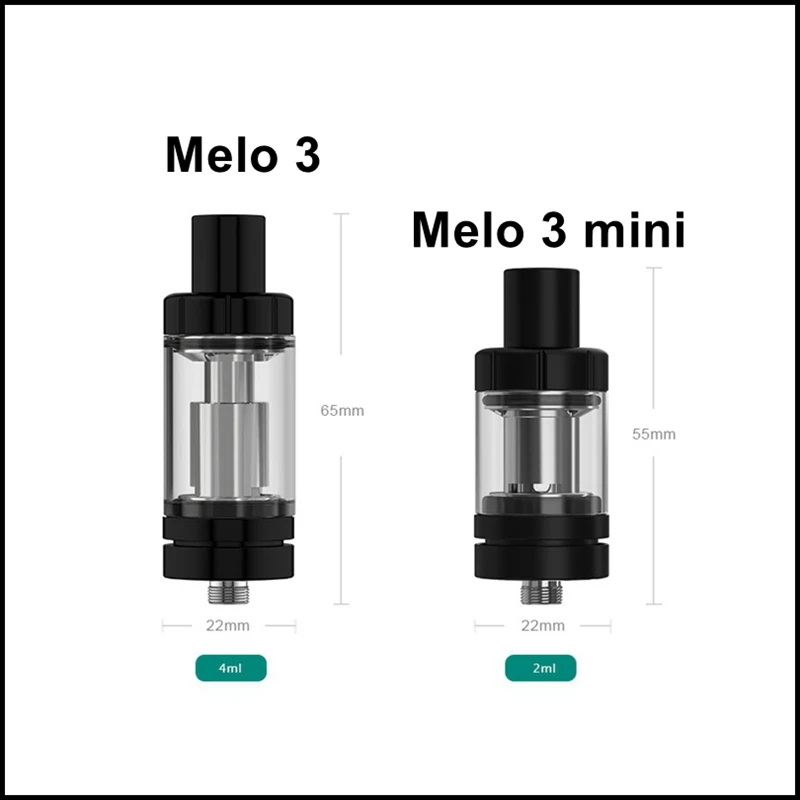 Melo 2 бак: Нормальные стеклянные ~ 4,5 млMelo 3 Емкость: обычное стекло ~ 4 млМини-бак Melo 3: обычное стекло ~ 2 мл, пузырьковое стекло ~ 4 млIStick pico kit (с мини баком melo 3): 2 млIStick pico kit (с баком melo 3): 4 млMelo 4 D22 Емкость: нормальное стекло ~ 2 млMelo 4 D25 внутренний бак: обычное стекло ~ 4,5 мл, стеклянный ~ около 6 мл