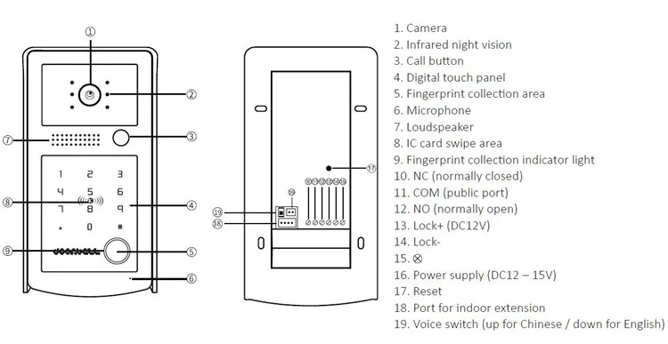 Эта система видеодомофона fignerprint для дверных колокольчиков выполняет функции контроля доступа, такие как датчик отпечатков пальцев, пароль, IC карта, удаленное разблокирование от внутреннего расширения и т. Д. Он прост в использовании с его безопасной, стабильной и релейной производительностью, которая может использоваться для дома, виллы, школы, банка, больницы, офиса и других мест.