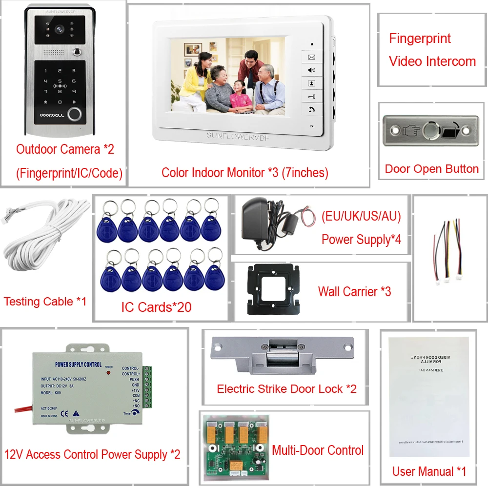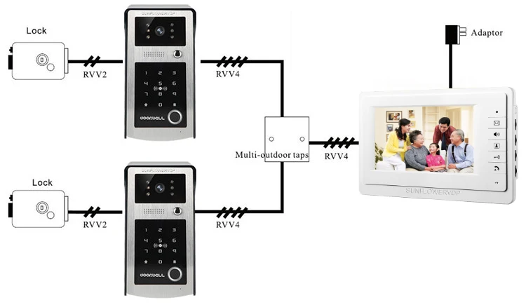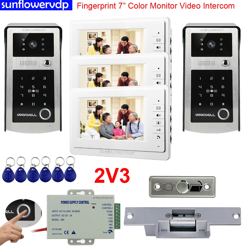 Для 2 двери видео домофон для дома, определение отпечатка пальца Камера видео-дверной звонок Системы с 7 "Цвет Крытый Экран 3 + электрический дверной звонок