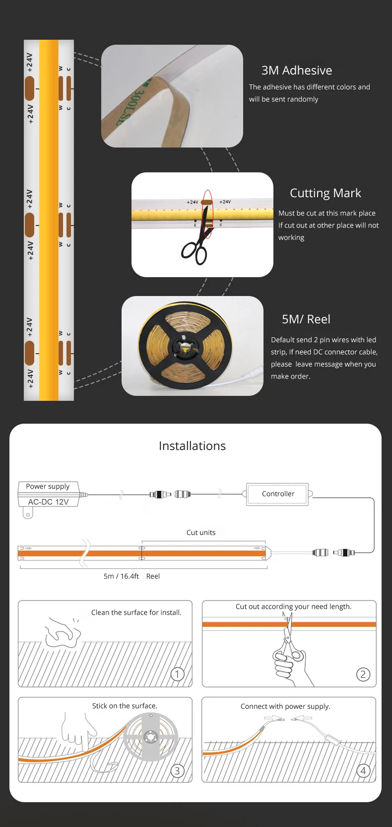 Товар: светодиодный COB полоскиСветодиодный чип: EpistarДлина: 0,5 м, 1 м, 2 м, 3 м, 4 м, 5 мШирина: 4 мм/8 мм/10 ммРабочее напряжение: 12 В постоянного токаМощность: 5 Вт/мCut out: 2,5 см/блокиКоличество светодиодов: 480 светодиодов/метрRA: 90Световой поток: 110 лм/ВтСветильник: белый, натуральный белый, теплый белый, красный, зеленый, синий, желтыйКласс водонепроницаемости: IP44Применение: в помещении
