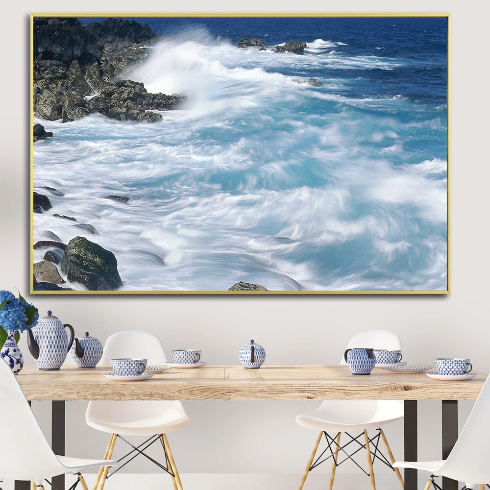 Синий водопад, Горный пейзаж, холст, украшение для дома, Океанский скальный пейзаж, картина маслом, постер, настенная живопись