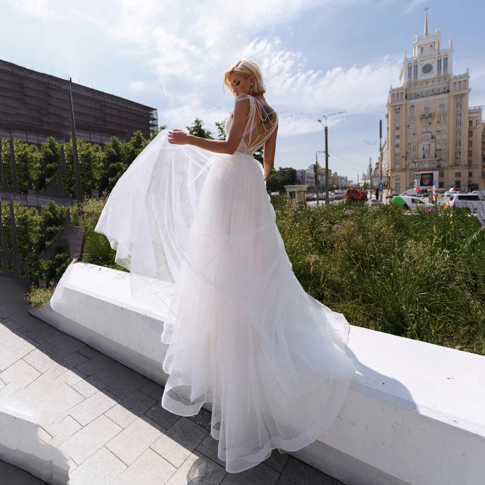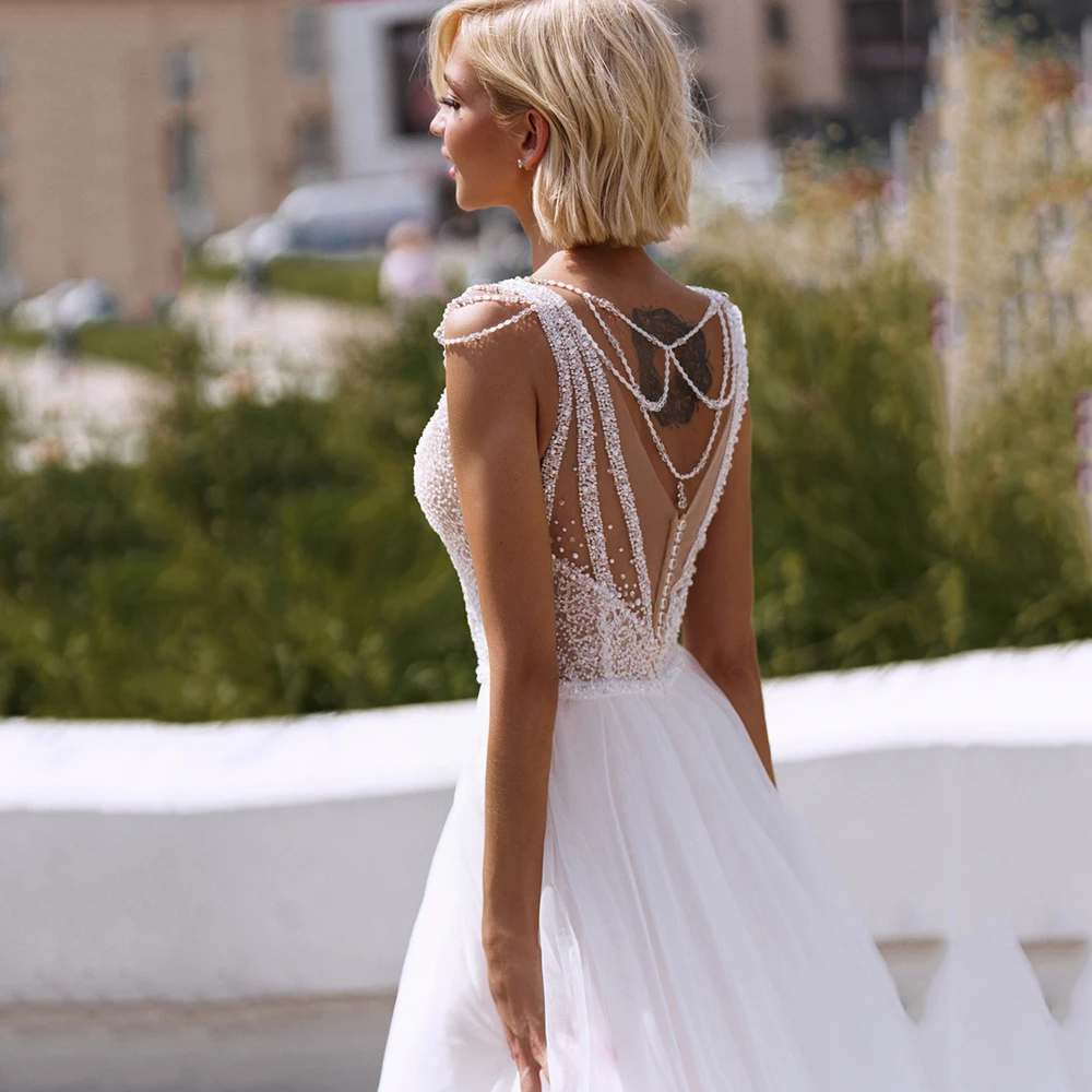 Женское свадебное платье с открытой спиной, из тюля, с V-образным вырезом и бисером