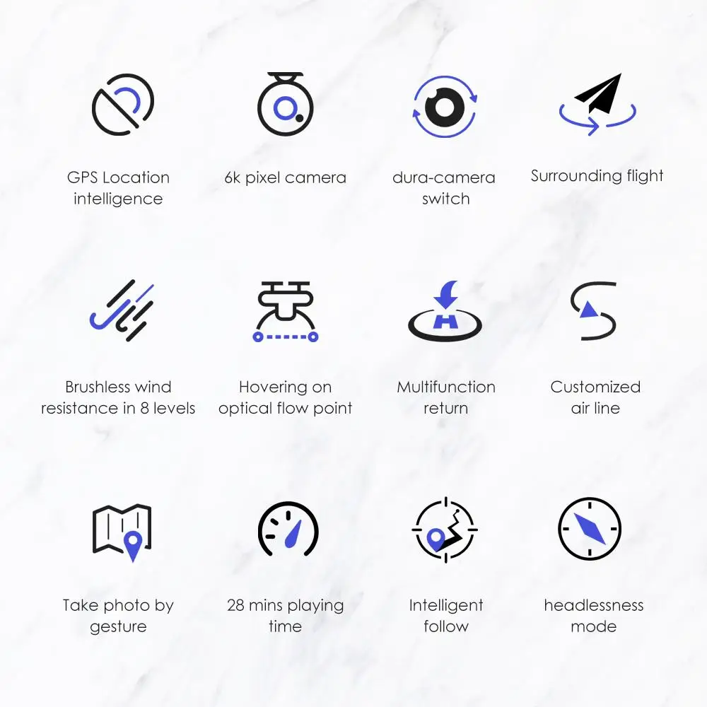 Функция: вверх/вниз, вперед/назад, поворот влево/вправо, босветильник, 3 уровня скорости света f, светильник, позиционирование GPS, следуйте за мной, окружасветильник f, фара Waypoint F, режим удержания высоты, Безголовый режим, возврат одной кнопкой, Взлет/посадка одной кнопкой, Wi-Fi FPV, камера/видео