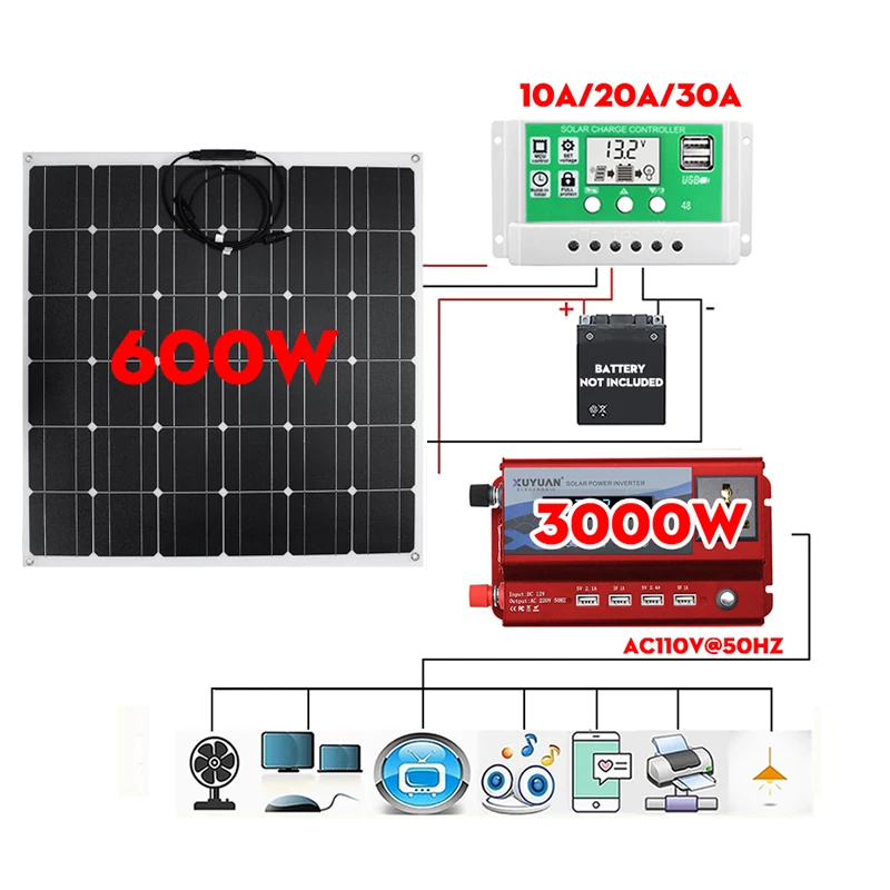 Особенности:● Гибкие солнечные панели (600 Вт)-Высокая мощность, подходит для улицы и RV-- ЭТФЭ передней панели, гибкие, светильник и прочный, светильник вес-Эффективность монокристаллических кремниевых солнечных элементов составляет 24-26%.-- 4x люверсов более удобны в установке.-Водонепроницаемый IP65 класс, подходит для использования на открытом воздухе под дождем. Светильник-Подходит для кемперов, лодок, домов, садов, сараев или ферм● Контроллер солнечной батареи (30A)1. Встроенный промышленный микрочип.2. Большой ЖК-экран с регулируемыми параметрами.3. Зарядка аккумулятора PWM.4. Встроенная защита от короткого замыкания, защита от открытого замыкания, защита от обратного соединения, защита от перегрузки.5. Двойной МОП-защита от обратного тока, низкое тепловыделение.6. Параметры системы управления регулируются.● Инвертор мощности (3000 Вт)1. Преобразуйте 12 В постоянного тока в 110 В переменного тока.2. Переключатель ВКЛ/ВЫКЛ контролирует вентилятор3. Автоматическое выключение тепла4. Дополнительная емкость от перенапряжения5. Широко используется для всех видов электрического оборудования, потребляемая мощность которого равна напряжению переменного тока 220 В, таких как мобильный телефон, ноутбук, электрический светильник, цифровая камера, видеофон, телевизор, CD-плеер, DVD, электрический вентилятор, электрические инструменты и так далее.6. Безопасная конструкция зарядки защищает ваши устройства от чрезмерного тока, перегрева, короткого замыкания и перезарядкиВстроенный вентилятор охлаждения помогает уменьшить тепло7. Корпус из алюминиевого сплава, антиоксидантный, прочный, модный и прочный8. Непосредственно Подключите к автомобильному прикуривателю или аккумулятору, удобно использовать9. Идеально подходит для использования в автомобиле для отдыха, работы и кемпинга