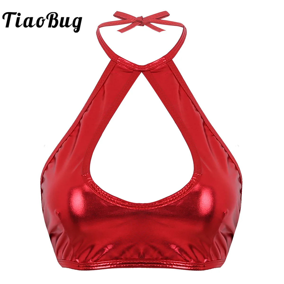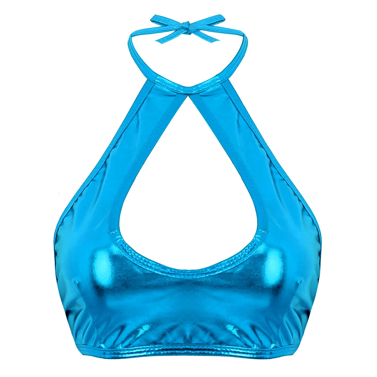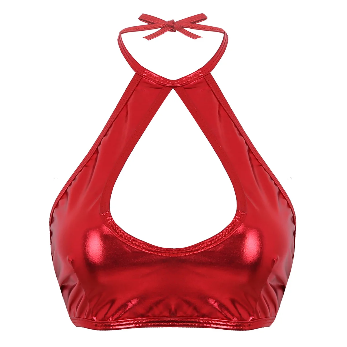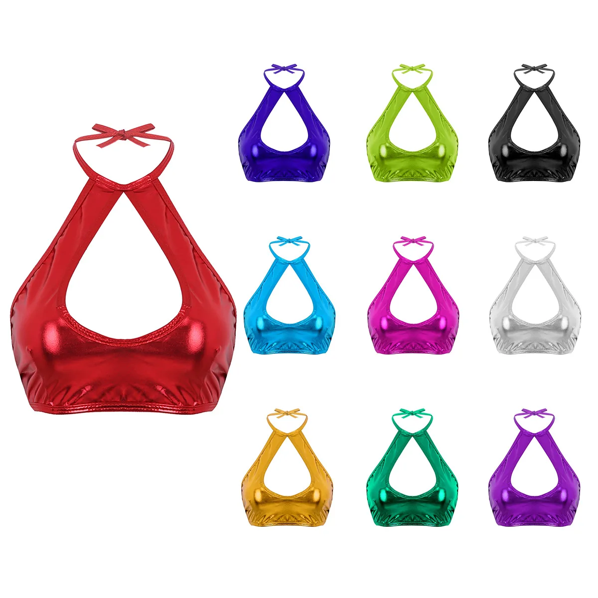 Женские блестящие укороченные топы для ночного клуба и вечевечерние, кожаные топы с воротником-халтером для танцев на шесте